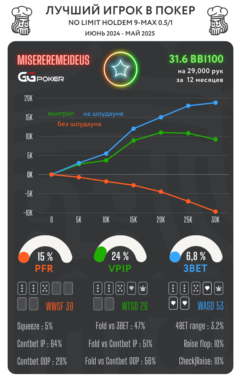 MiserereMeiDeus по результатам выступил почти так же, как лидер предыдущего лимита, но его стратегия отличается меньшей агрессией на постфлопе, о чём свидетельствуют «низкая» красная линия и показатель WWSF.