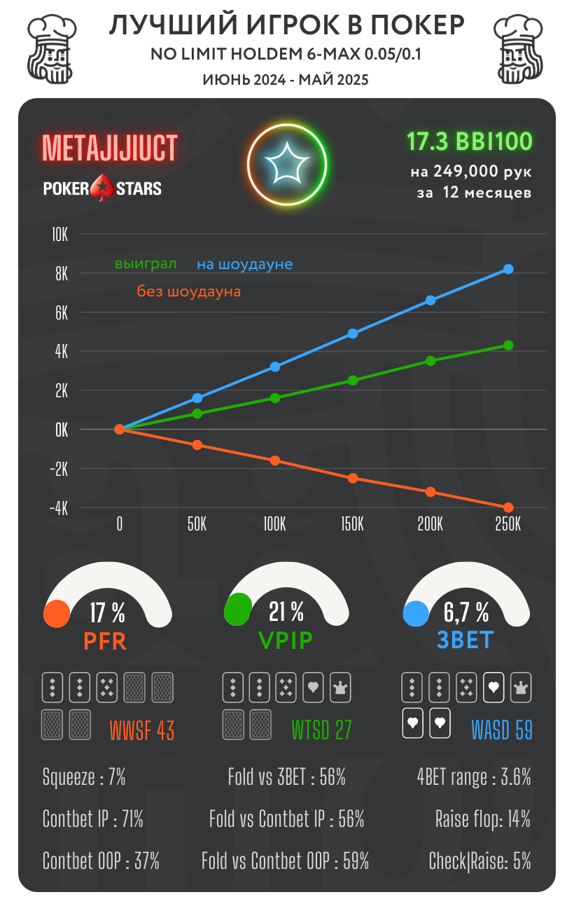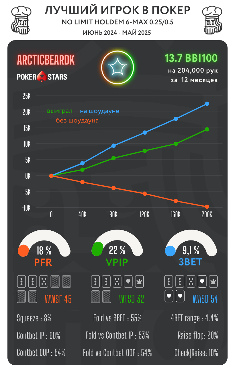 Для почти всех регуляров 6‑макс столов в наших разборах характерен умеренный тайтово‑агрессивный стиль игры со средними значениями: VPIP ~ 22 %, PFR ~ 19 % и 3‑bet ~ 9 % за короткими столами. Контбет в позиции обычно выше, чем без позиции. Адекватная защита рейзами на флопе встречается с частотой около 9-12 %. Но использование даже более широких ренджей, особенно в позиции, тоже допустимо. Большинство лидеров рейтинга не перебарщивают с агрессией, поэтому их красная линия на графике находится в нисходящем тренде под углом примерно 5-10°.