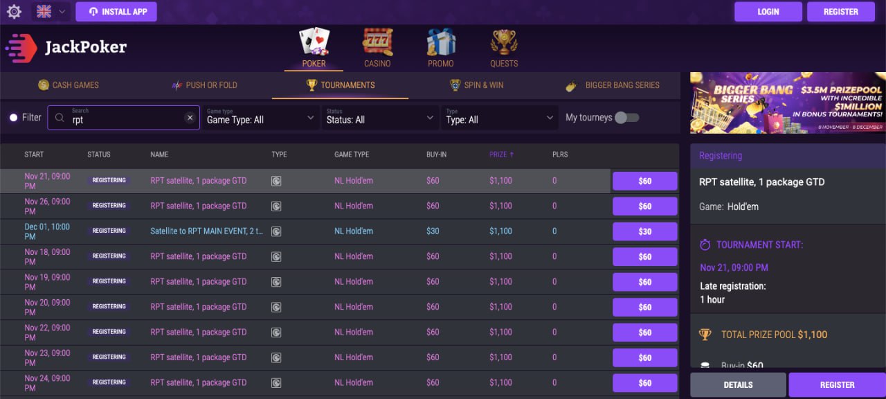 Бай-ины в сателлиты, где разыгрываются пакеты участников, стартуют от $30. С полным расписанием сателлитов можно ознакомиться в лобби JackPoker: