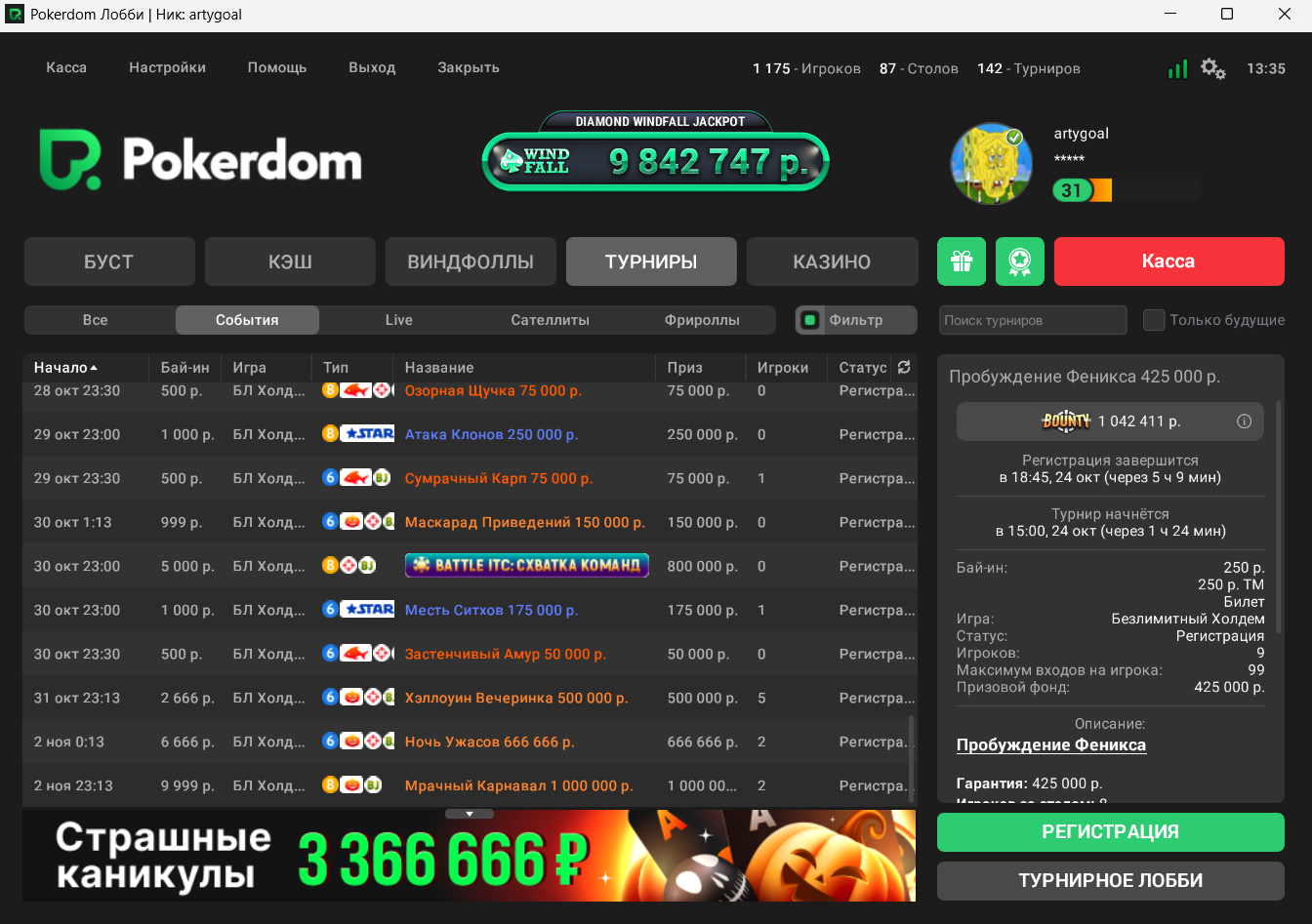 Кэш-игроки на Покердом также могут присоединиться к празднованию Хэллоуина через специальные лидерборды с призовым фондом ₽350,000. В лидербордах смогут принять участие игроки в холдем и быстрый покер следующих лимитов: