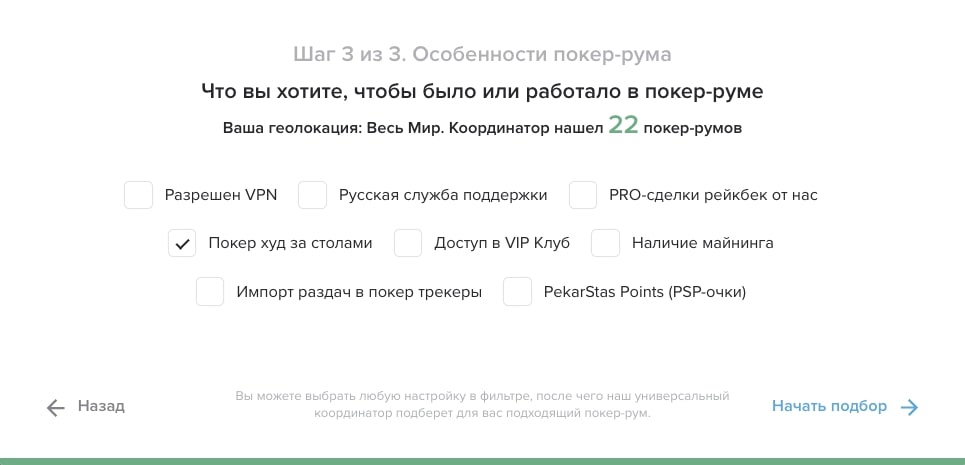 Кликнув по синей кнопке «Начать подборку покер-румов» вы перейдете в специальный инструмент подборки покер-румов. Там вам на выбор будут предложены критерии, которые, на ваш взгляд, являются главенствующими при выборе комнаты, и на основании выбранных критериев инструмент выдаст подходящие этим критериям покер-румы. Вот как это все выглядит: