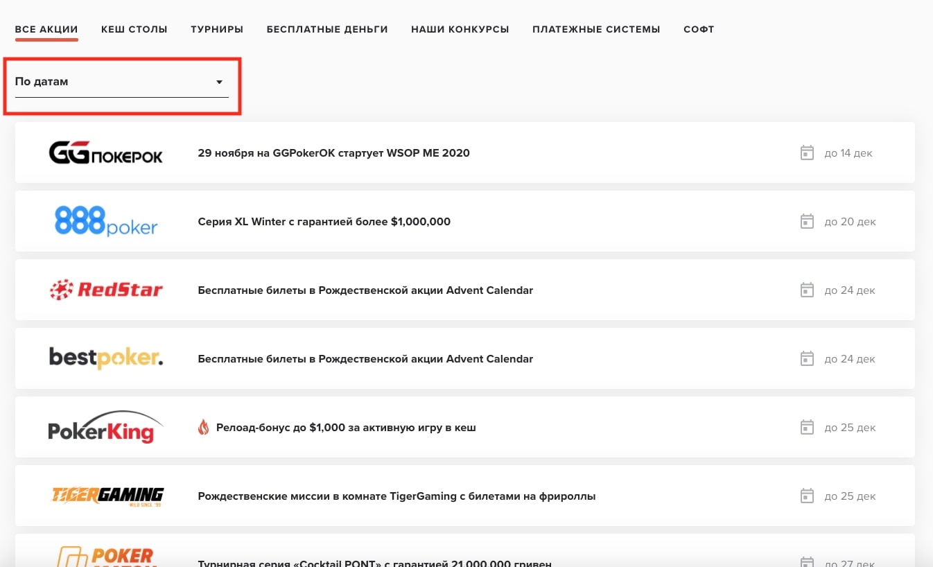 Каждая акция прикреплена к индивидуальной карточке покер-рума. Можно выбрать два вида отображения карточек – «по группам» или «по датам»: