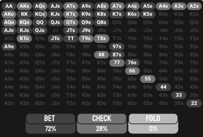 Что будет, если мы немного изменим диапазоны? Все останется таким же, но теперь мы начнем чаще блефовать с KQo. Не в 100%, но хотя бы в 75% случаев, хотя до этого это был совсем редкий бет.