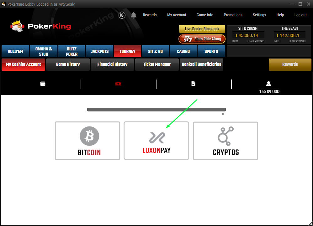 Чтобы запросить кэшаут из PokerKing на Luxon Pay игроку необходимо иметь на балансе покер-рума минимум $50 и сделать следующие шаги: