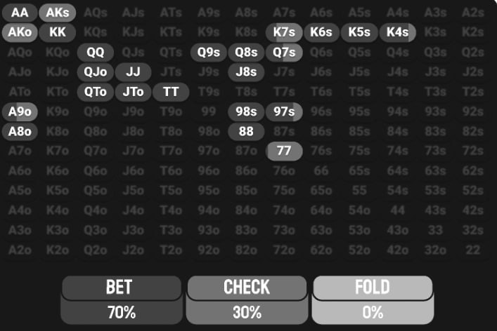 Это хорошая карта для CO, и поскольку он слишком много рук сфолдил на терне, BTN сбавляет обороты. В ГТО-примере он ставит 70% рейнджа, теперь же — только 60%.