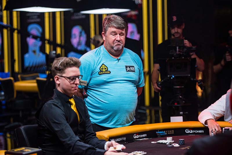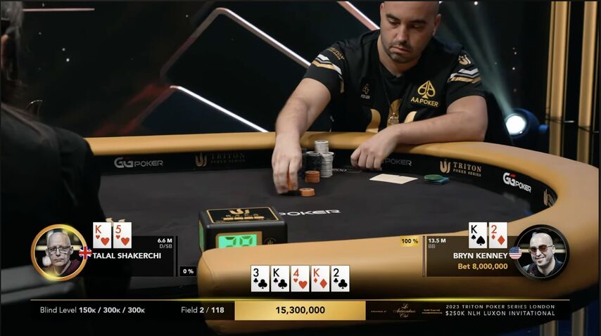 В топ-3 не повезло Пуннату Пунсри, которого в этих турнирах причисляют то к любителям, то к профессионалам. Он проиграл крупный банк с королями, а остаток фишек отдал в префлоп-выставлении с AQo, оба раза у Талала Шакерчи были AJ. В хедс-апе случилась интересная раздача: у Шакерчи с флопа был старший трипс, а Брин Кенни купил на ривере фулл-хаус и запушил, но Талал выкинул и этим продлил себе жизнь в турнире.