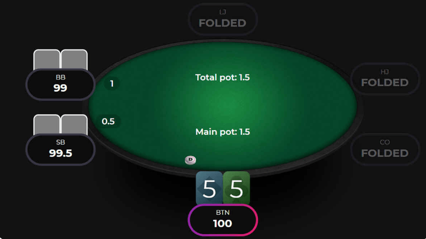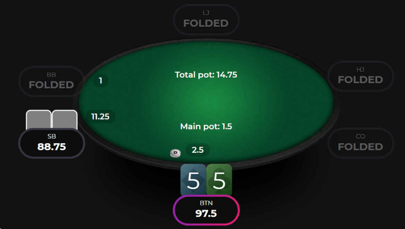 55 — отличная рука для рейза с этой позиции. На BTN вы можете плюсово открывать очень широкий диапазон (около 42% всех рук). Все карманные стоит открывать в этой ситуации, включая 22.