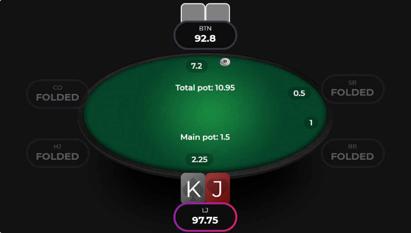 Детали: 100 бб стек. Вы открылись 2,25 бб. BTN 3-бетнул до 7,2 бб. Кеш-стол с рейком 5% (кап рейка 0,6 бб).