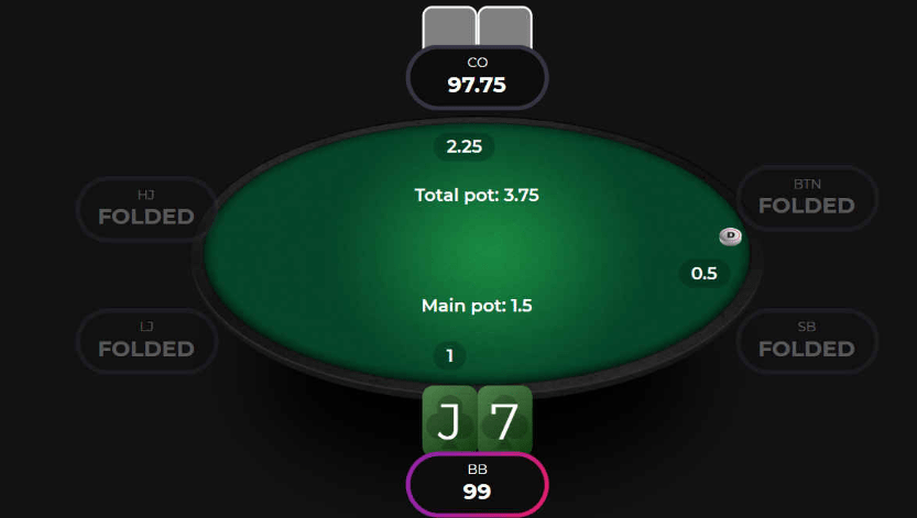 Детали: 97,75 бб стек. Вы открылись 2,25 бб. BB заколлировал. В банке 5 бб.