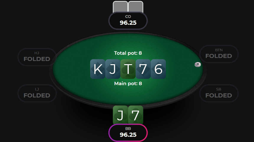 Две пары же находятся где-то между. Поэтому вы должны чекать. Если вы получите ставку, нужно будет решать, стоит ли коллировать, исходя из пот-оддсов и диапазона вашего оппонента.