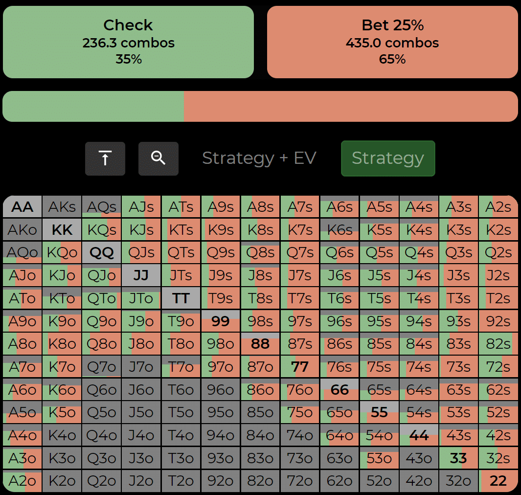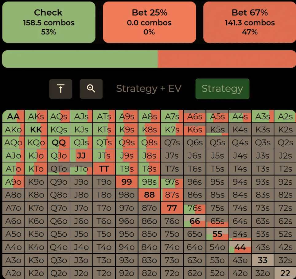 Наблюдайте за оппонентами. Лидят ли они в борды, которые им подходят, как в этом случае? Если да, то стратегия солвера будет работать. Если нет — а некоторые вообще никогда не лидят с BB — то, хоть солвер и чекает 53%, вам лучше поднимать частоту чека еще выше. На практике можно чекать почти все.