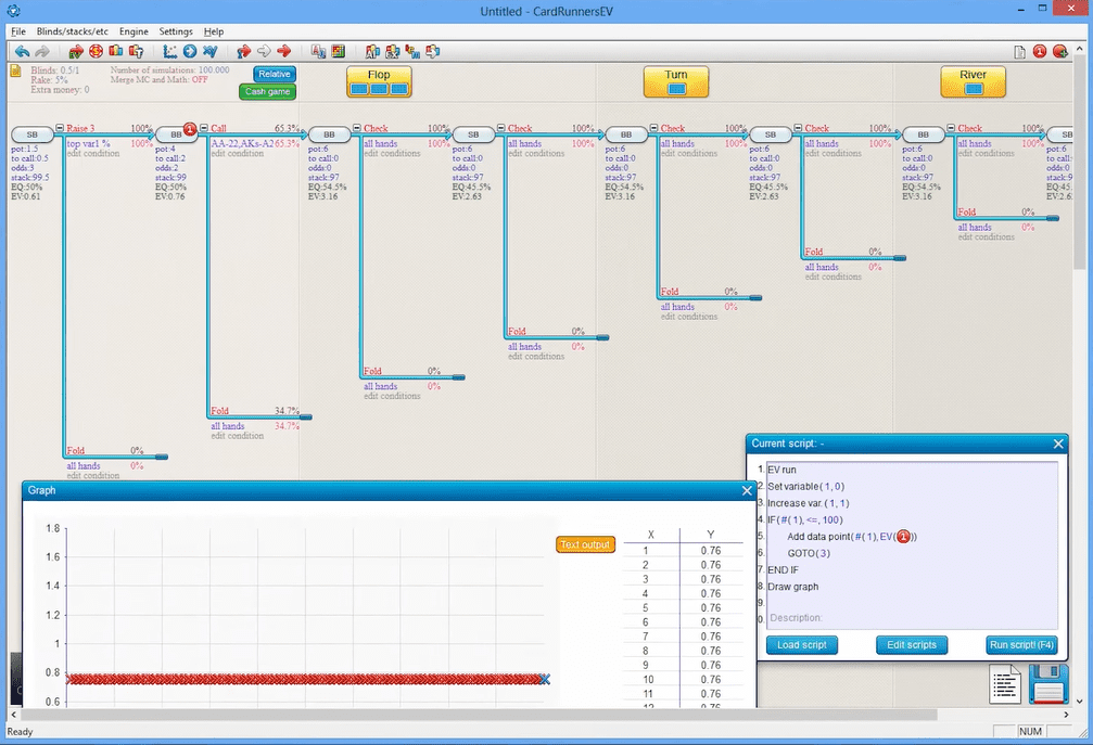 По сути, это был солвер, в который нужно вручную вводить каждый узел. На этих скриншотах показан простой пример, где у каждого игрока всего одна точка принятия решения. Но для каждого игрока вы можете прописать варианты действий в каждой точке, и CardRunners EV рассчитает линию с максимальным EV.