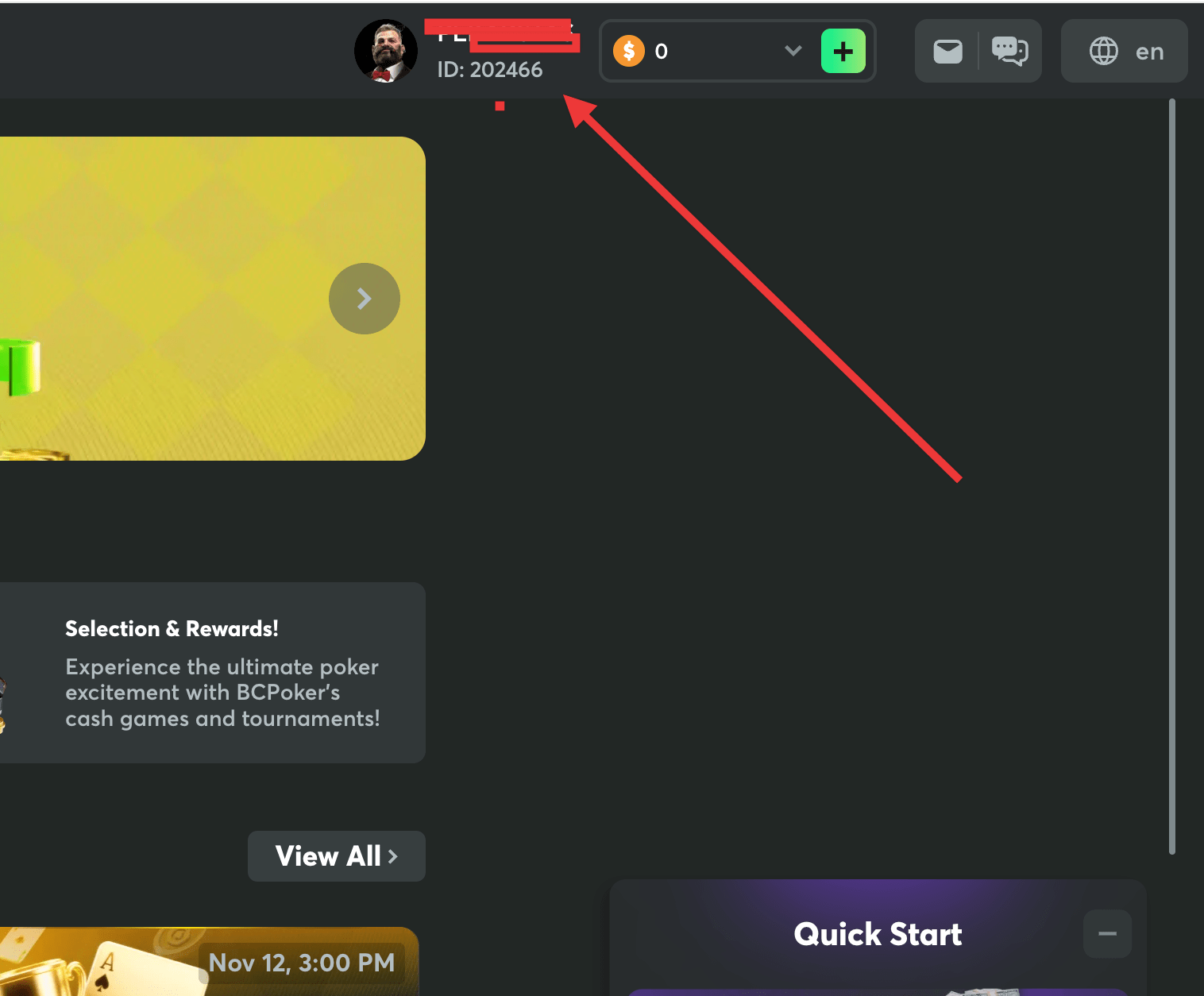 Перейдите на страницу BCPoker на нашем сайте и создайте аккаунт по нашей партнёрской ссылке, либо укажите при регистрации код: PEKAR - ОБЯЗАТЕЛЬНО! На странице BCPoker, привяжите ваш аккаунт BCPoker к вашему профилю на PekarStas. Укажите ваш ID аккаунта, который можно найти сразу после регистрации, как на скриншоте ниже пример. Это необходимо, чтобы мы могли идентифицировать участников и передать награды победителям.