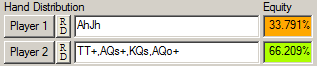 Что нам нужно сделать? Нам нужно забить нашу руку и диапазон оппонента в PokerStove и нажать кнопку «Evaluate». Все просто. Давайте предположим, что мы оупен-рейзер и на руках у нас . Диапазон 3-бета оппонента: TT+, AQs+, KQs, AQo+.