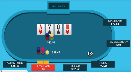 Опять же, я всегда хочу стараться играть в агрессивный покер. К тому же, еще одна вещь, о которой стоит задуматься, это способен ли наш оппонент читать руки, если вы заколлируете. Ведь вы изображаете что-то типа Ах, которые не хотят далеко заходить, или Qх, которые тоже не рады будут больше вкладывать деньги в пот, возможно какие-то дрова (хотя дрова обычно разыгрывают более агрессивно), поэтому вполне ожидаемо, что на терне оппонент с большой вероятностью продолжит агрессию.