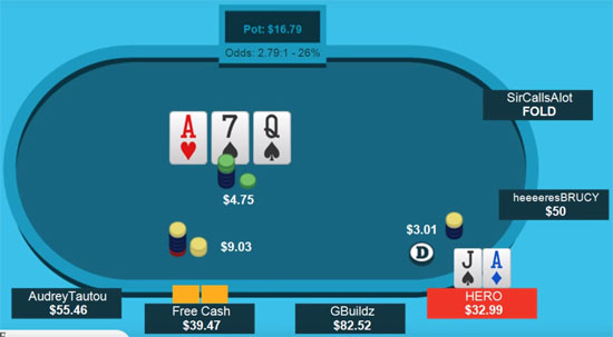 Что ж, мы возвращаемся к той точке, где мы можем пойти другим путем. Я действительно не собираюсь здесь фолдить, если я конечно не буду знать, что мой оппонент супер-тайтовый и самый прямолинейный игрок в мире, и что он не 3-бетил бы AQ на префлопе, но для этого нам нужна будет очень-очень специфическая информация на игрока. Поэтому обычно я буду давать здесь отпор.