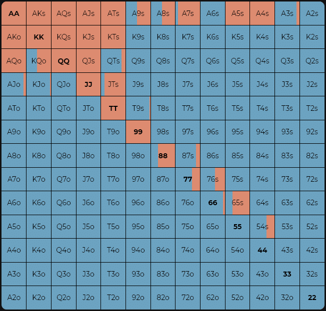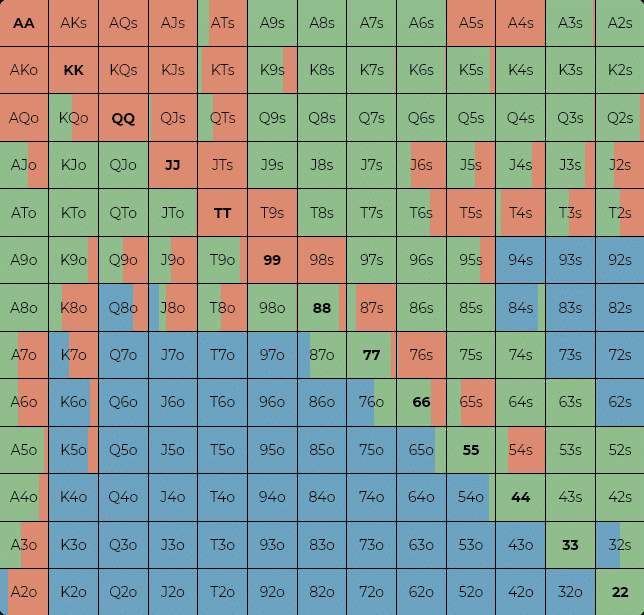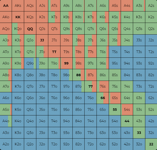 Поэтому солверы рекомендуют стратегию «3-бет-онли» с каждой позиции, кроме BB (в глубоких стеках, без анте).