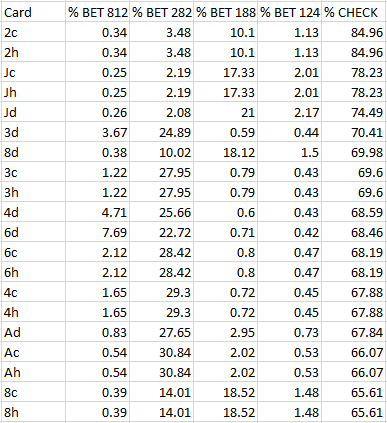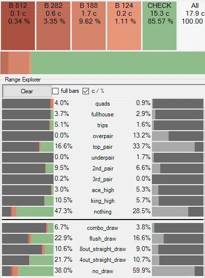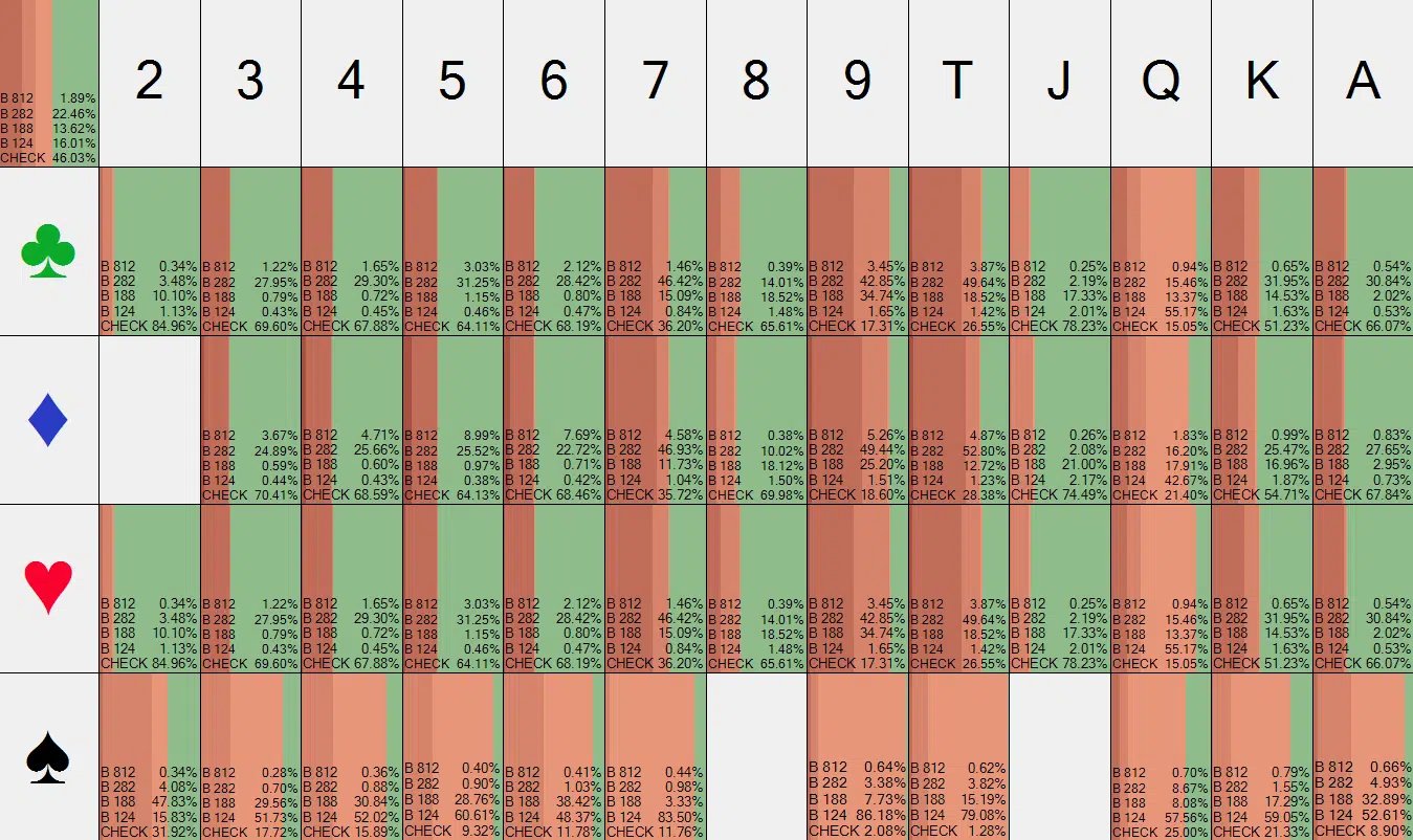 На этом этапе солвер, по сути, говорит: «Окей, нам пришел один из худших тернов в колоде». Он понимает, что многие его блефы промахнулись, и что ему часто придется отдавать банк, доходя до того, что он будет чекать даже значительную часть своих самых сильных рук.
