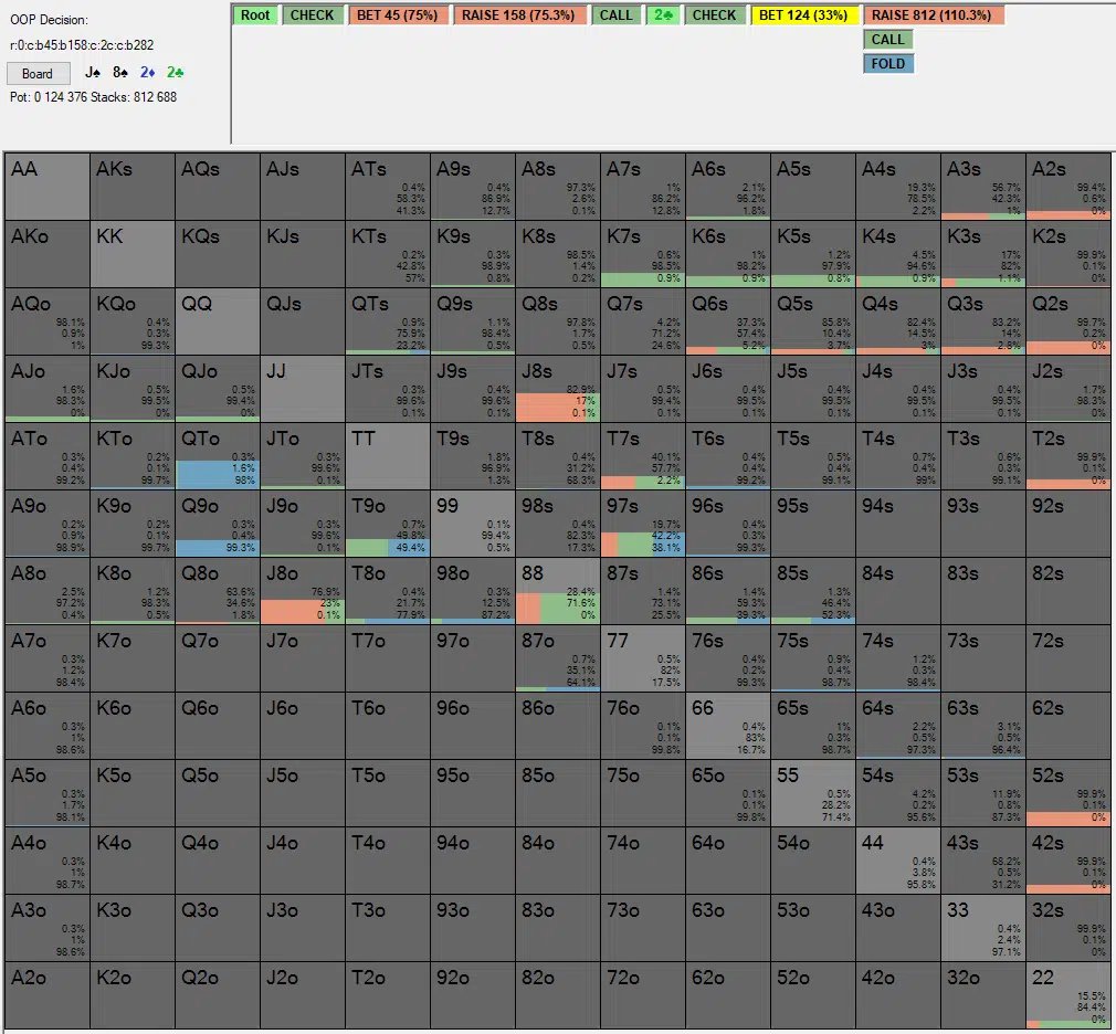 Наконец, солвер чек-коллит все топ-пары и начинает подмешивать 8x, чтобы сдерживать блефы BTN и подводить его к индифферентности максимально близко.