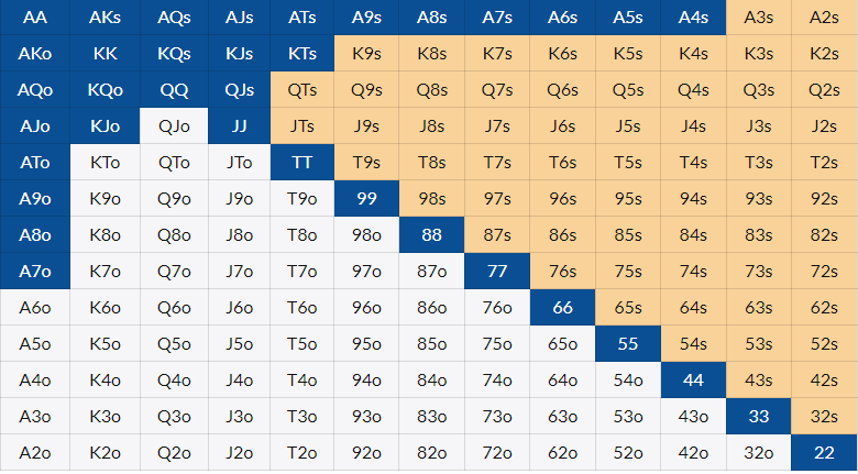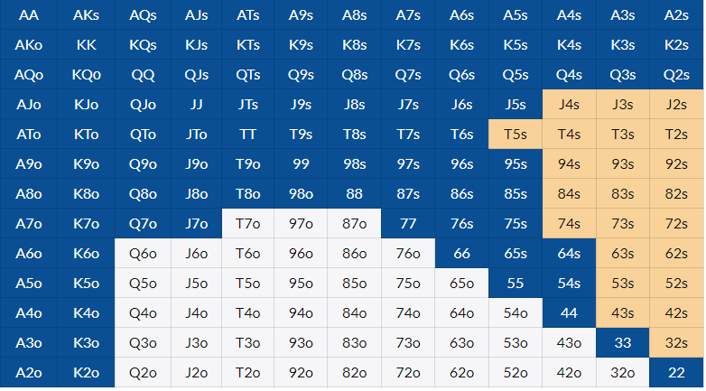 Как вы могли заметить, диапазон пуша с SB гораздо шире, чем на BU, потому что вам нужно выбить всего одного игрока. Кроме того, если игрок на BB вам кажется чересчур тайтовым, вы можете расширить свои рейнджи еще сильнее, потому что он не будет откаллывать вас с правильным диапазоном.