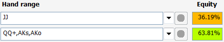 В следующем примере у нас JJ и мы открываемся с МР. Баттон 3-бетит нас до $10 и ход возвращается к нам. Теперь же JJ намного слабее, чем предыдущие АА, усложняя тем самым ситуацию. Давайте подумаем, будет ли 4-бет здесь идти на вэлью. Давайте предположим, что баттон 3-бетит нас исключительно с QQ+/AK. Если мы сделаем 4-бет, сбросит ли он какую-нибудь из этих рук? Если нет, то мы просто создадим огромный банк, имея всего 36% эквити против его диапазона. 4-бет не будет идти на вэлью до тех пор, пока мы не будем впереди его диапазона, с которым он продолжит в ответ на наш 4-бет.