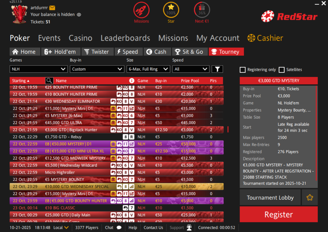| пт, 24 октября | 19:30 | 25,000 GTD MYSTERIUM | 125 |