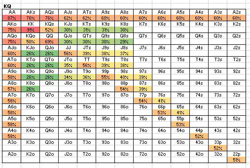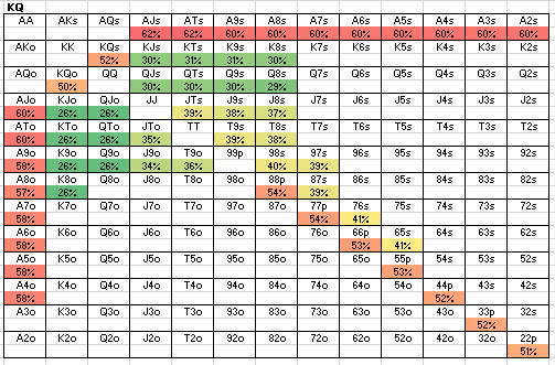 Вы можете видеть, что мы отлично стоим против рук, отмеченных зеленым цветом, это руки, которые мы доминируем, такие как KJ, QJ. Руки типа J9 или коннекторов, отмеченные желтым, находятся в районе 30% эквити против нас. Но все тузы впереди и все карманные пары впереди нас также.