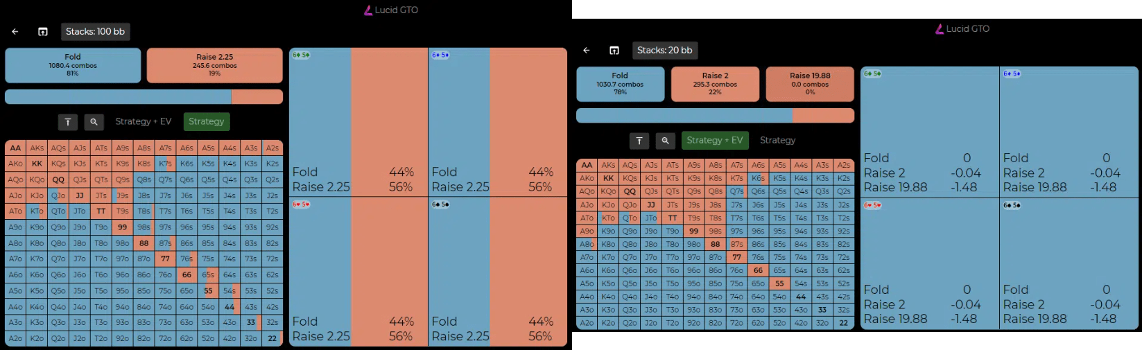 65s — это чистый фолд с EV=-4бб/100 в стеках 20 бб (даже с анте), а вот при 100 бб (даже без анте) — это уже околонулевая рука, которую можно открывать.