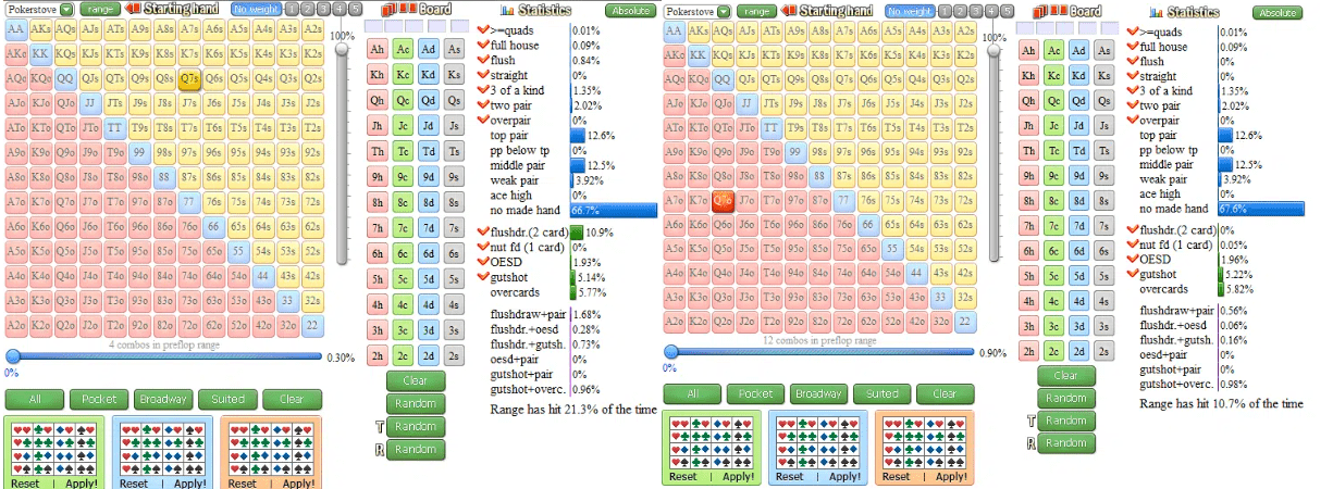 По шансам на допер, сет, фулл-хаус или каре обе руки одинаковые. Но Q7s может собрать флеш с флопа в 0,84% случаев — а Q7o не может никогда. И это может звучать по-ботански, но это в бесконечное число раз чаще (0,84/0 = ∞).