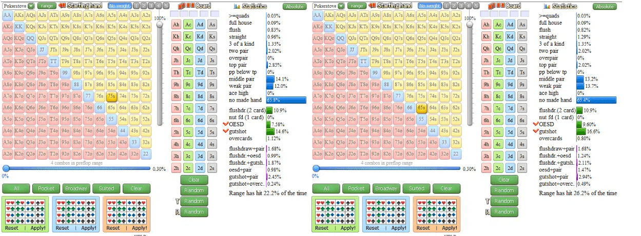 — лишь 0,96%. Всё дело в количестве комбинаций: 65s может попасть в четыре разных стритовых флопа (9-8-7, 8-7-4, 7-4-3 и 4-3-2), а 75s — только в три (9-8-6, 8-6-4, 6-4-3).
