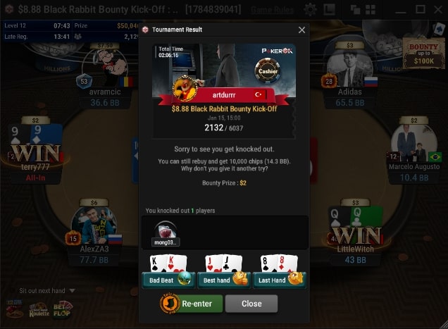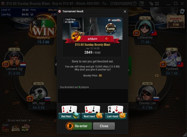 До конца поздней регистрации остается 5 минут, решаю сделать ре-энтри и вновь залетаю в турнир со стеком 12ББ.