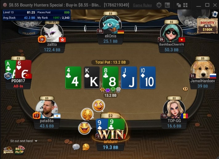 В начале 9-ого уровня выигрываю префлоп выставление, >