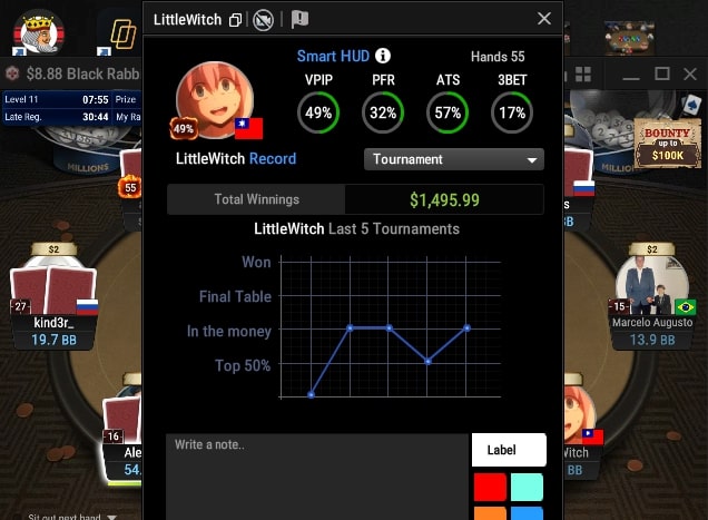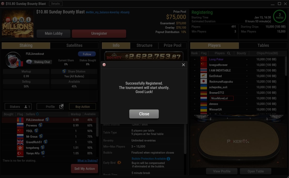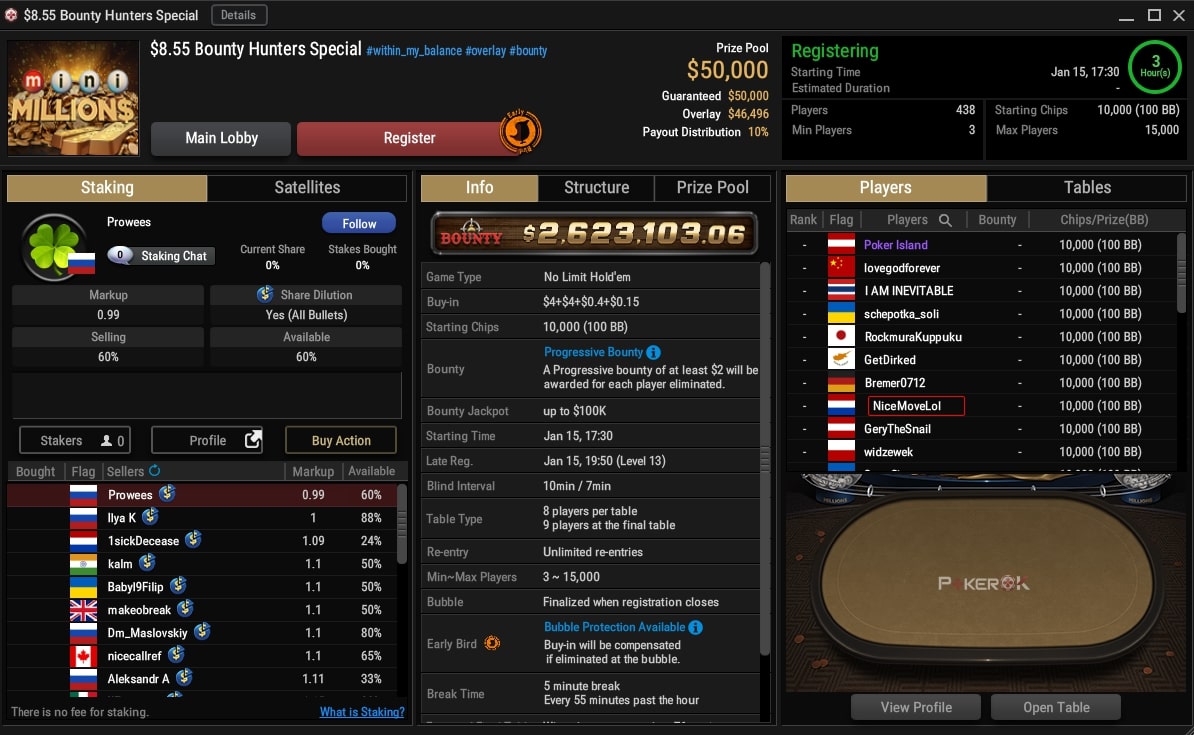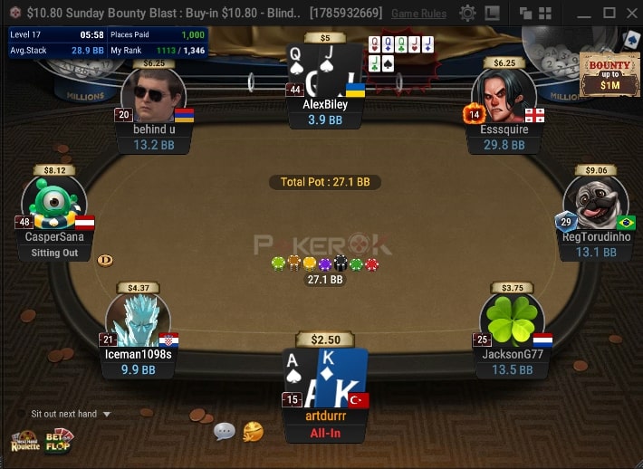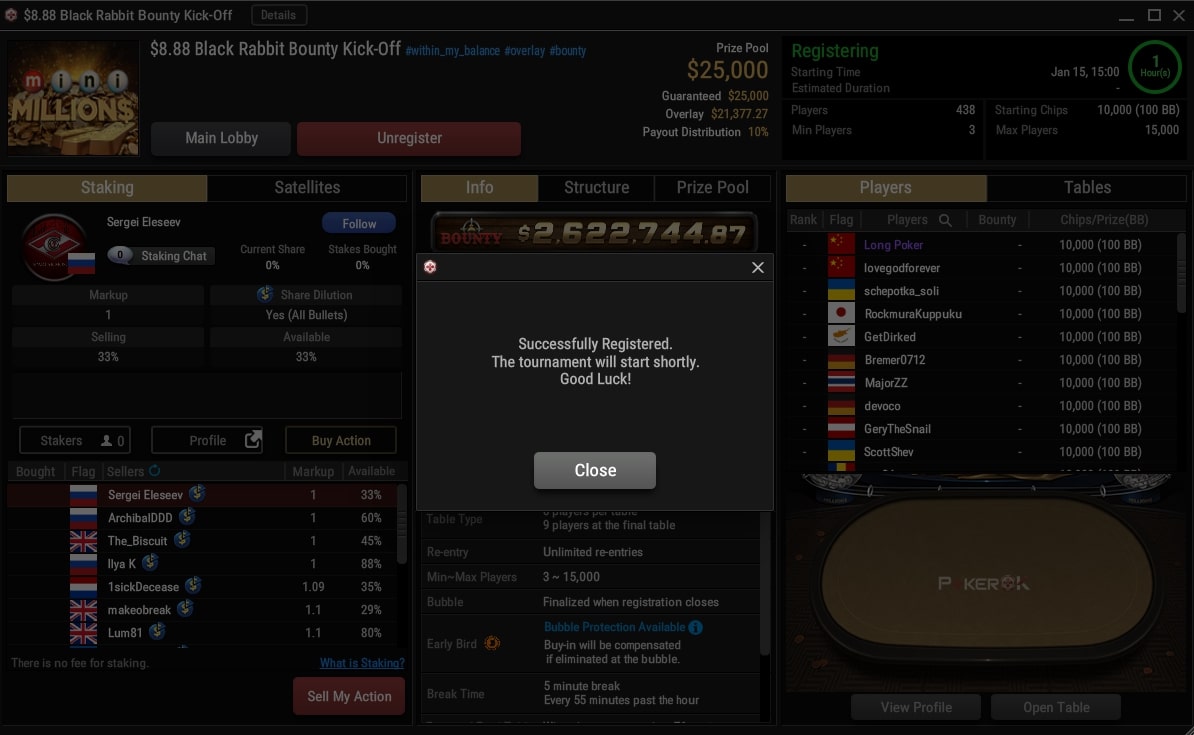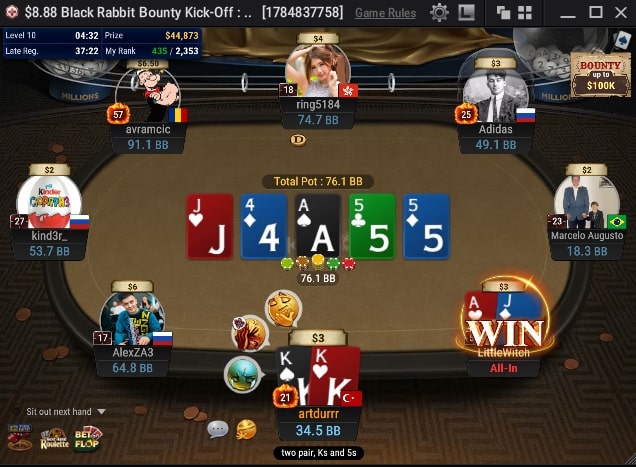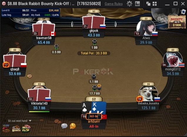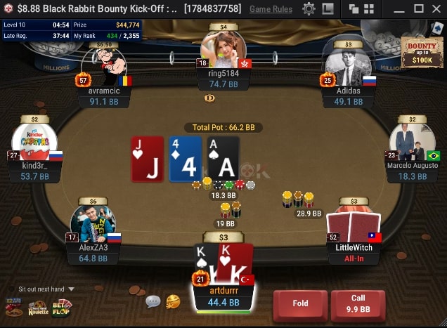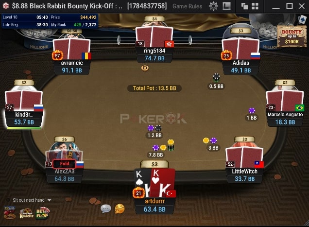 Как я уже писал выше, экшен на Mini Million$ начинался в 15:00 по МСК турниром $8.88 Black Rabbit Bounty Kick-Off, и в мою загрузку он, конечно же, вошел.