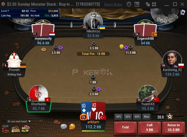 Уже к концу первого уровня у того самого оппа в стеке было не 260ББ, а 68ББ. Опен-рейз сделал игрок на УТГ, опп на УТГ+1 колл. Я решаю атаковать с МБ с .