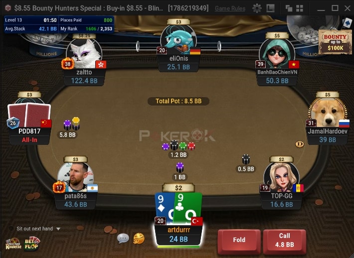 На мой пуш коллом отвечают сразу два игрока, на ББ с карманными девятками и на катоффе с карманными дамами