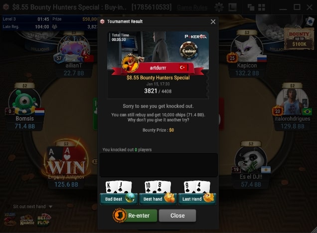 Так как турнир $25 GGMasters Bounty Special Edition проходит в формате фризаута, игрокам в нем доступен только один вход. Поэтому ре-энтри в нем недоступны, ГГ. Сессия на этом подошла к концу.