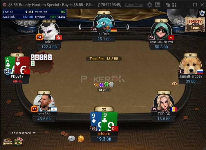 Блайнды тем временем растут, на середине 7 уровня остается 16ББ. Получаю карманных дам на МБ, все игроки до меня фолдят, я решаю атаковать игрока на ББ и пушу, но на пуш, к сожалению, он отвечает пасом.