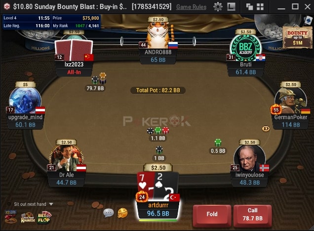 Тяжелый (не очень) спот в начале 4-ого уровня, на ББ получаю , игрок со средней позиции открывается пушем на 80ББ. Долгие миллисекунды раздумий, но нахожу силы прожать фолд.