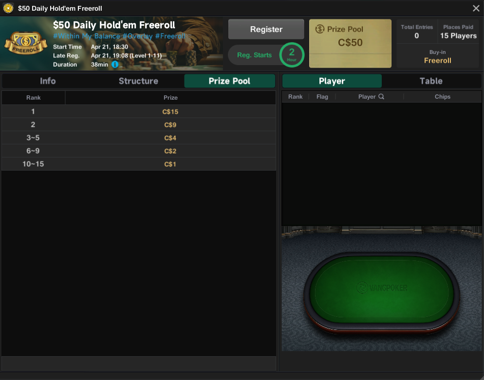 Фрироллы в покере – это бесплатные турниры с реальным призовым фондом, которые позволяют познакомиться с игрой в покер-руме Vang Poker без внесения собственных средств.