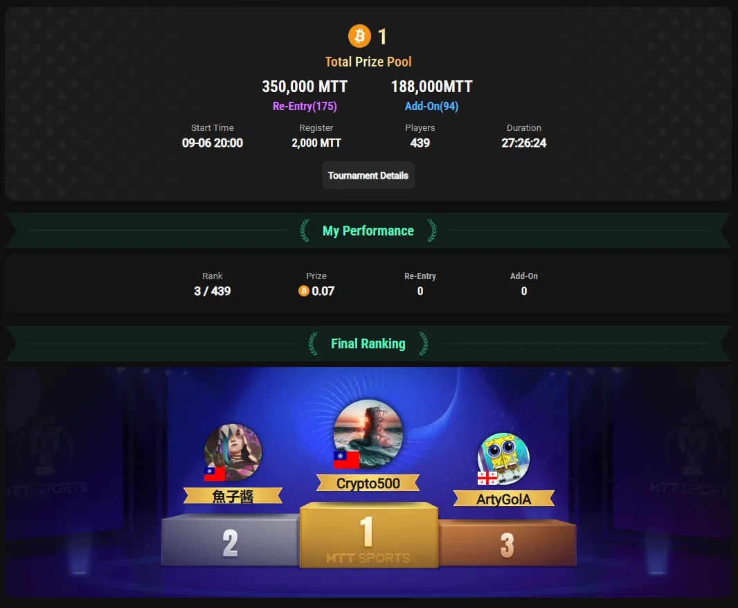 Вот уж не думал, что магия блога сработает так быстро. В пятницу выложил первый пост, а уже в воскресенье оформил топ-3 на MTT Sports (эта комната, кстати, есть в разделе партнёрских румов на сайте) в их главном мейджоре — турнире с призовым фондом 1 BTC.