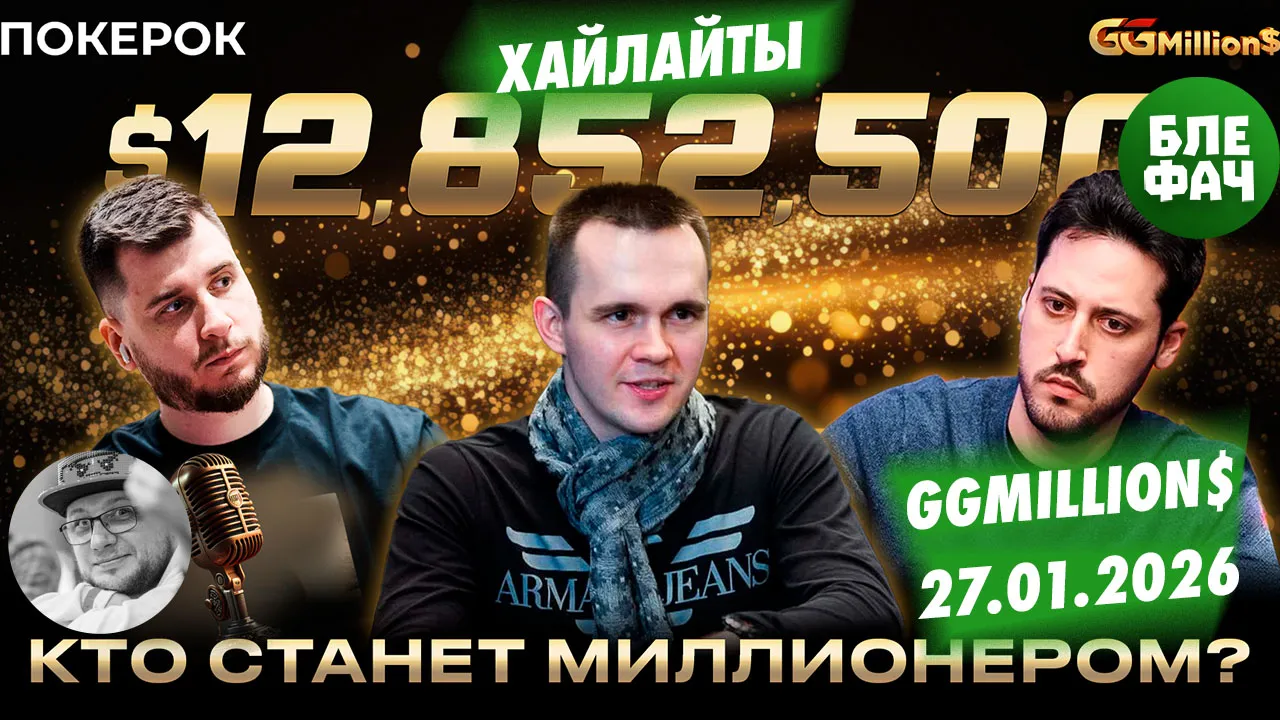 Сразу двое наших игроков вышли чиплидерами на огромную финалку GGMillion$ в конце января 2026 года — Никита Кузнецов и Никита Бодяковский. И для обоих выступление на ней было важным — по своим причинам Главред Блефача Егор Дергачёв отобрал и прокомментировал лучшие и важнейшие раздачи с финального стола, которые были объединены в этот разбор: