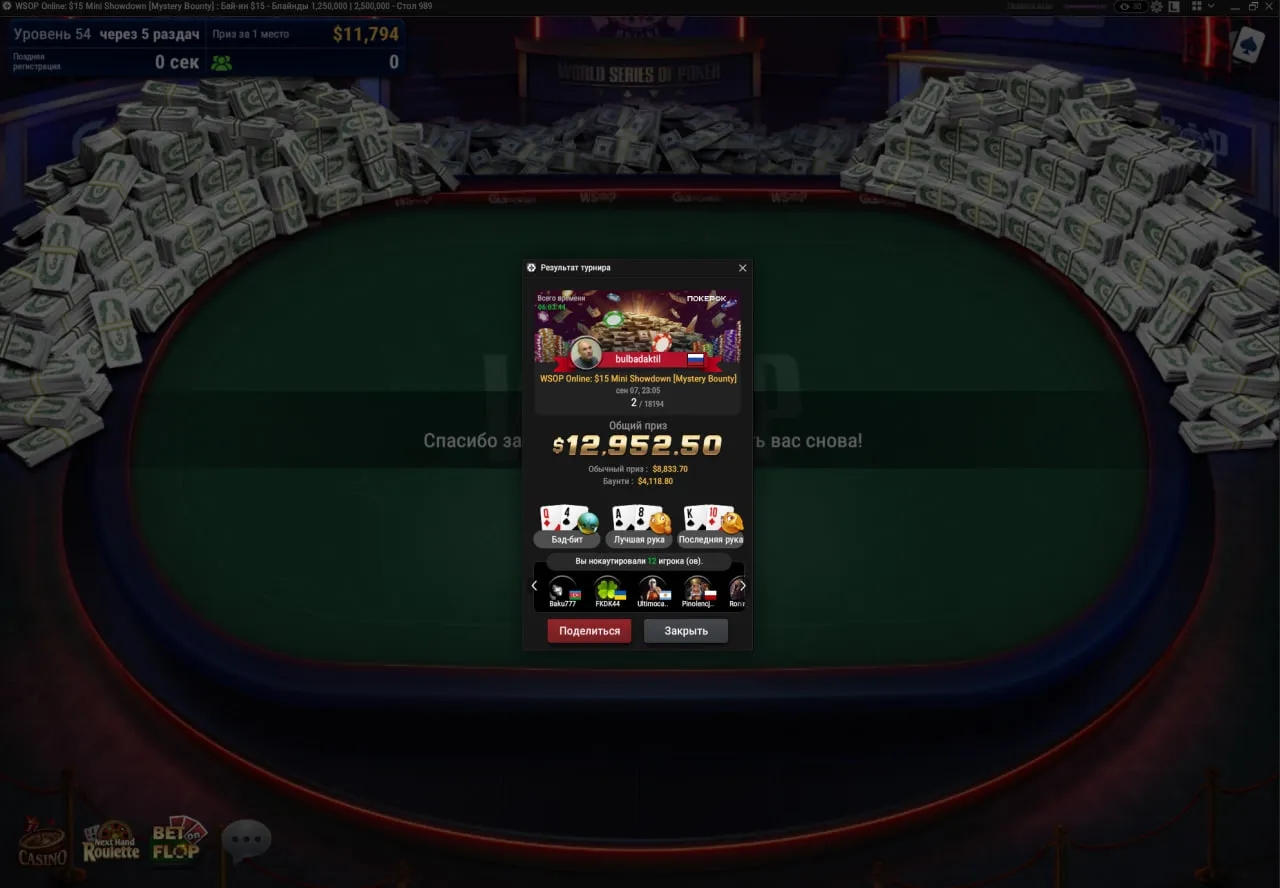 Ну, а финишной чертой стал любимый многими турнир в формате Mystery Bounty. Тут тебе и сундуку золотой, да и дипран (второе место) на 18К человек просто отличный — суммарно почти на $13,000.