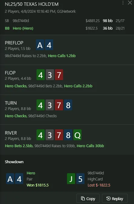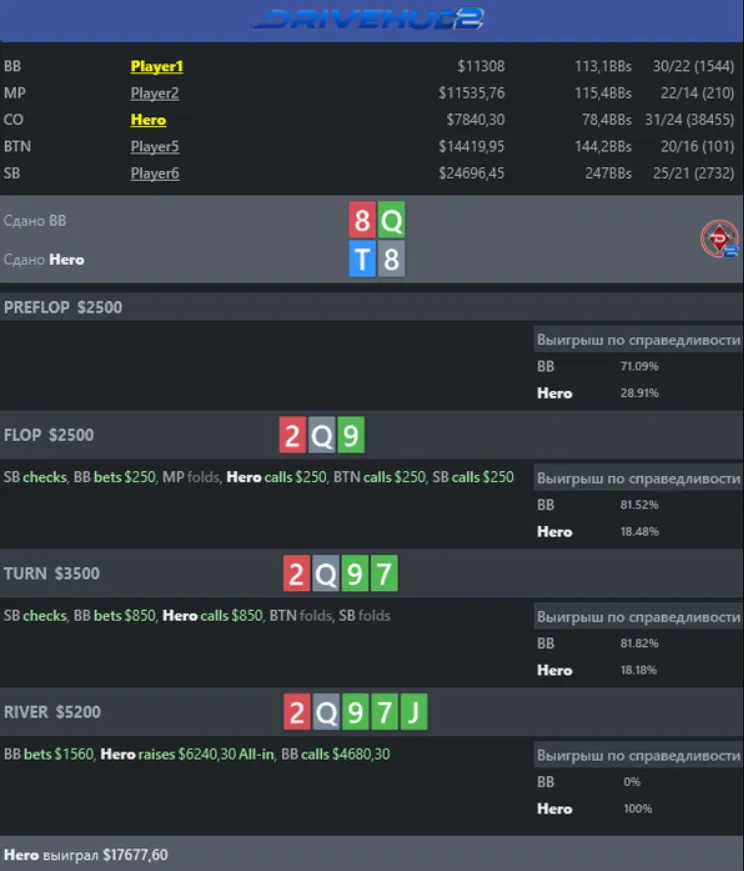 Разумеется, Geeeel2 не только катал, но и обучался. По его словам, сильно помог GTO Wizard. Вот одна из красивых раздач.