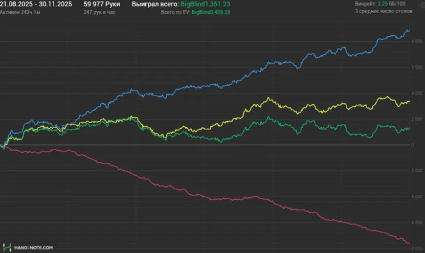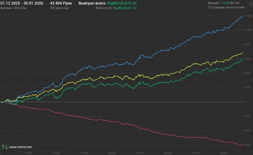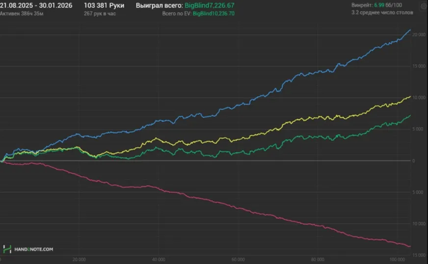 «На это у меня ушло около 400 часов. Получается, что в среднем я уделял катке где-то 80 часов в месяц. Сюда же можно добавить еще 20-25 часов теории. Для дефолтного рега уделять покеру всего 100 часов в месяц – это преступление. Но, к сожалению, я не живу за счет дохода с покера», – рассказывает Сергей.