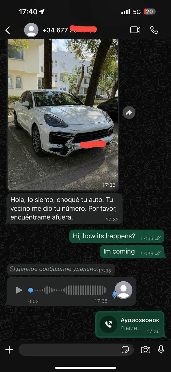Пока я думал над своим коварным планом, как разыграть друга, в Ватсапе пришло сообщение с незнакомого испанского номера (скриншот выше) в сообщение фото моей побитой машины, далее я ахерел, не было ни капли сомнений, что это правда, в этот момент я гулял с ребенком, схватил его с горки, пристегнул в коляску и рванул в сторону дома, прокручивая мысли, как я сейчас буду разбираться с каким-то испанцем, оформлять страховой случай с ленивой местной полицией и ремонитровать авто в сервисе с постоянной «Маньяной», что детали еще не пришли и мол ждите, мы вам сообщим.