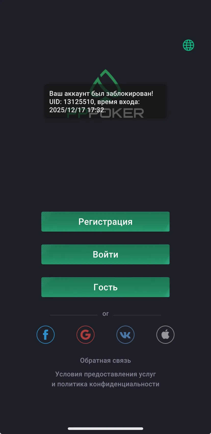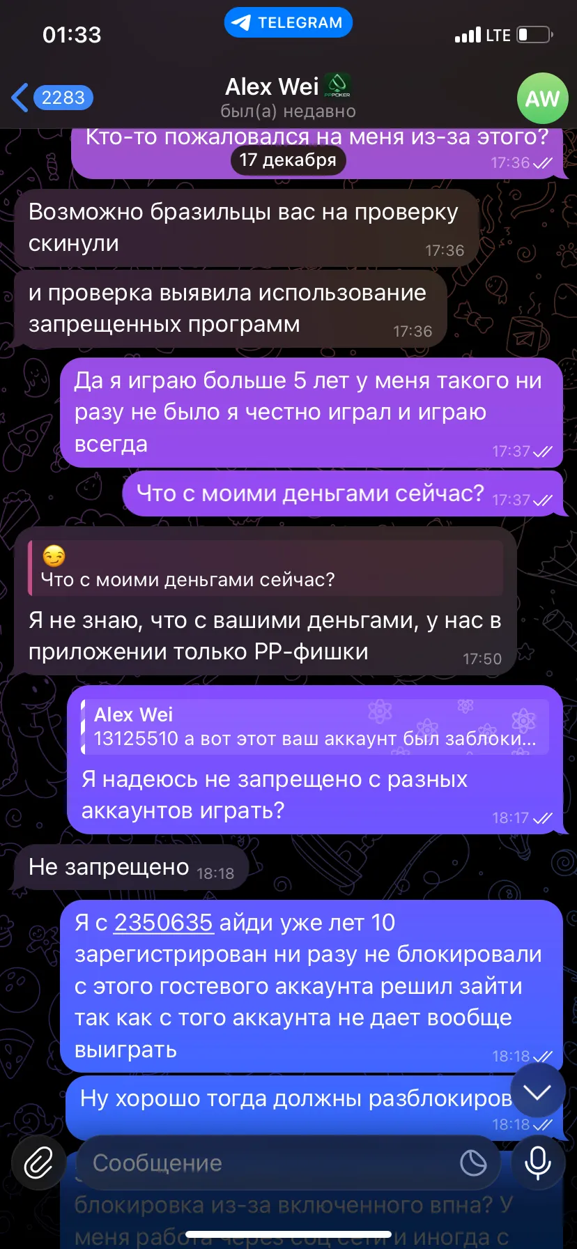 Приветствую всех! Играю с запуска в приложении PPPoker окончательно решил прекратить если не будет сделана глубокая и ручная проверка по моему аккаунту где лежит больше 2000$. Опишу вкратце ситуации с которыми вы можете столкнуться играя здесь: Администраторы могут забрать и закрепить игроков с которых вы получаете % за собой, в то время пока вы отдыхаете и в оффлайне-так я потерял больше 6 игроков сотрудничал в качестве агента. Какие-то клубы дают завышенный курс на 25-50% таким образом вы не получите часть фишек которые должны были выдать по курсу в союзе , после того как вам удастся выиграть хорошую сумму они должны будут перечислить деньги в убыток себе и начинают придумывать различные отыгрыши, делают недельную проверку на перелив фишек, затем неделю на античит - чтобы психологически вы сели за стол и проиграли фишки с новыми условиями и за такой срок. Это касается (честных клубов) Есть так же черные клубы, где вам могут выдать фишки под бекинг , но не заплатить ничего при выйгрыше у них состоят много ботов с подставными игроками которые слабо играют и расчет на то, что вы будете делать пополнения , но они не состоят в союзах и лучше обходить их стороной. 15 декабря я вышел с основного аккаунта который создан с основания сайта и сыграно много раздач, перешел на гостевой аккаунт и начал игру с чистого листа и ника- чтобы все кто ставил метку на мой аккаунт и имели преимущества благодаря VIP картам не поняли кто это и собирали заново статистику об игроке - это не запрещается уточнял у представителя рума Alex Wei да и аура надеялся что изменится от аккаунта. Данный клуб имеет чат с большим количеством игроков и ведут сеть во многих румах чем вызвали доверие к себе , позволили мне сделать огласку в чате о мошенническом клубе после чего со мной начали расплачиваться и перестали придумывать новые условия с блокировками. С депозита в 15000 рублей мне удалось выйграть 138000 и сделать примерно 30000 рейком за 2 дня в этот период были как минусы так и плюсы , запрашивался рейкбек раньше понедельника мне одобрили и зачислили. Спустя сутки я пытаюсь зайти пишет ваш аккаунт заблокирован! UID 13125510 , отписал администратору клуба ничего не может предпринять отправляет на оффициальную почту чтобы разбирался с ними самостоятельно-говорит это редкий случай. До этого в конце ноября были проверки от владельца старого клуба где подтвердилось что я чист и непричастен ни к чему по основному аккаунту. Обращаюсь на почту они каким-то образом делают проверку и подтверждают что я использую каких-то ботов и будет повторная проверка после которой повторно подтвердили в использовании каких-то читов. Я что только было возможно предоставлял, и пытался разобраться-предоставить информацию или нужные документы-предоставить доступ к устройству дистанционно, обьяснял что играл с гостевого аккаунта без использования ботов, читов, просил проверить в ручную психологию поведения за игрой, столы , и сам баланс - сравнить со старым UID которому 8 лет и не однократно удачно проходил проверку ничего за это время у меня не менялось и не скрывалось от них, устройство одно и тоже. В ютубе есть видео где играют с помощью подобных софтов через ИИ но там требуется пк и вход в аккаунт , но при гостевом аккаунте нельзя пройти верификацию и сделать логин с паролем, хотели однажды купить мой аккаунт с больш