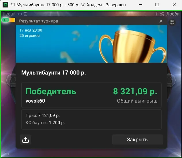 Но наконец начало отдавать. Удалось, например, затащить 110,000 рублей в туре по 1К. Да и вообще финалки стали появляться чуть чаще, чем раз в месяц. Не сказать, что прям банкролл есть (часть заноса пришлось вывести), но катать уже куда веселее.