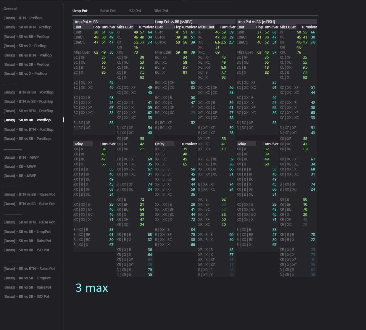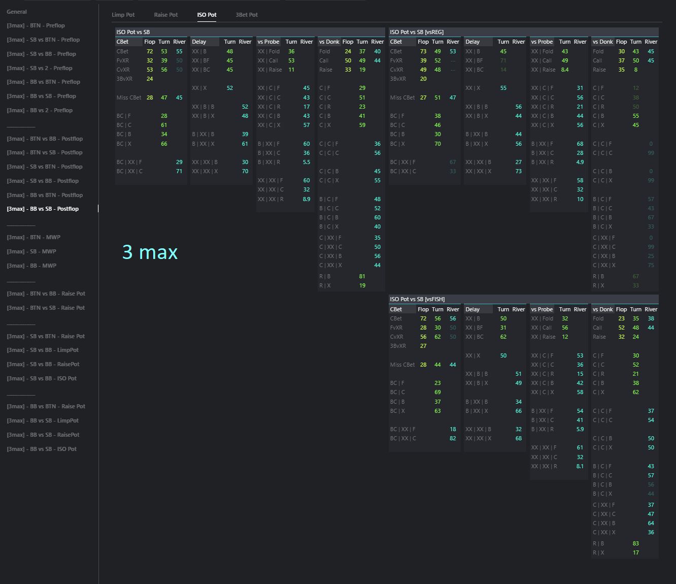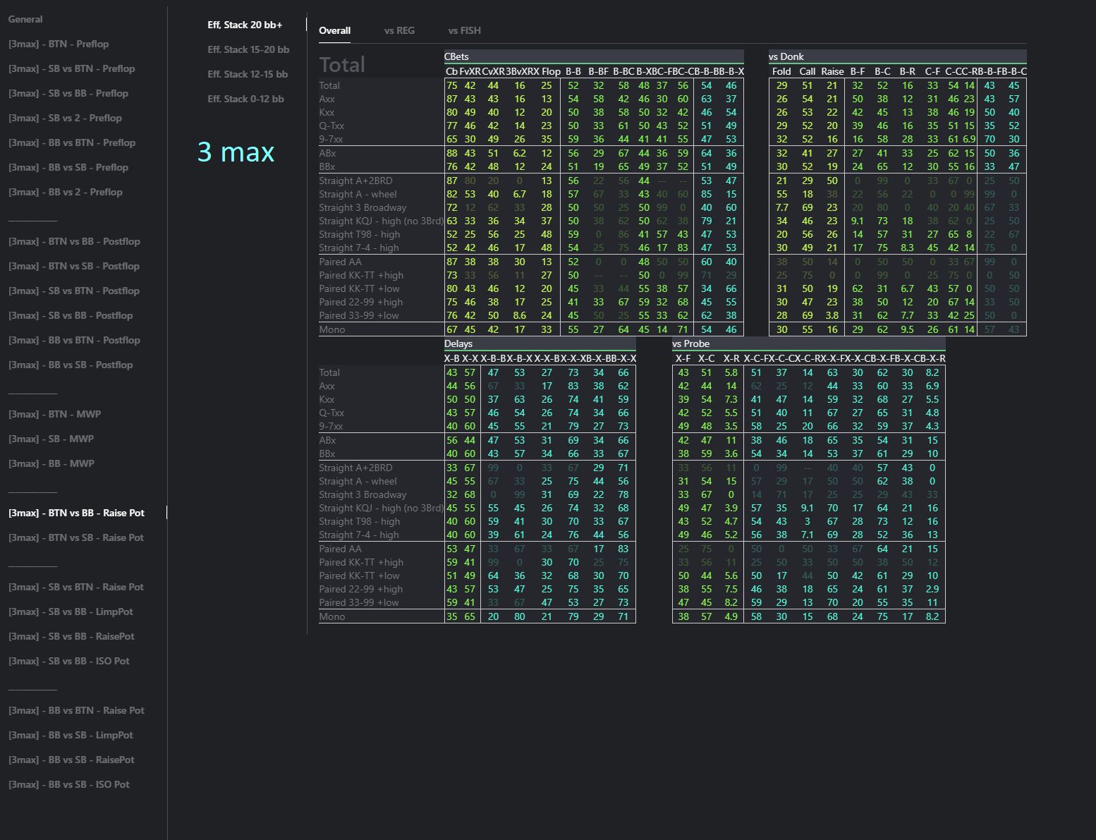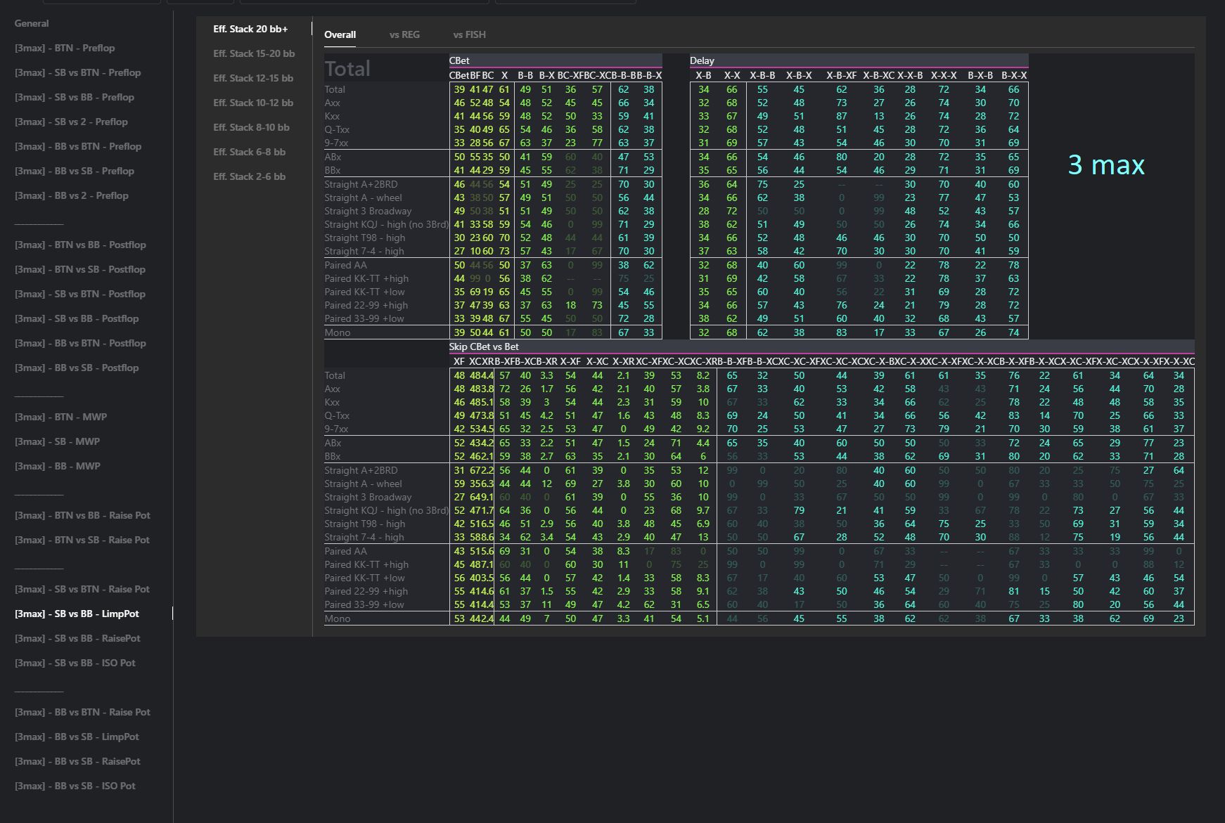 В 3-max каждое позиционное противостояние требует своего подхода. Игра SB против BB включает статистику по Limp Pot, Raise Pot и ISO Pot, причем для изо-банков без разделения по стекам. Аналогично структурирована статистика для BB против SB.