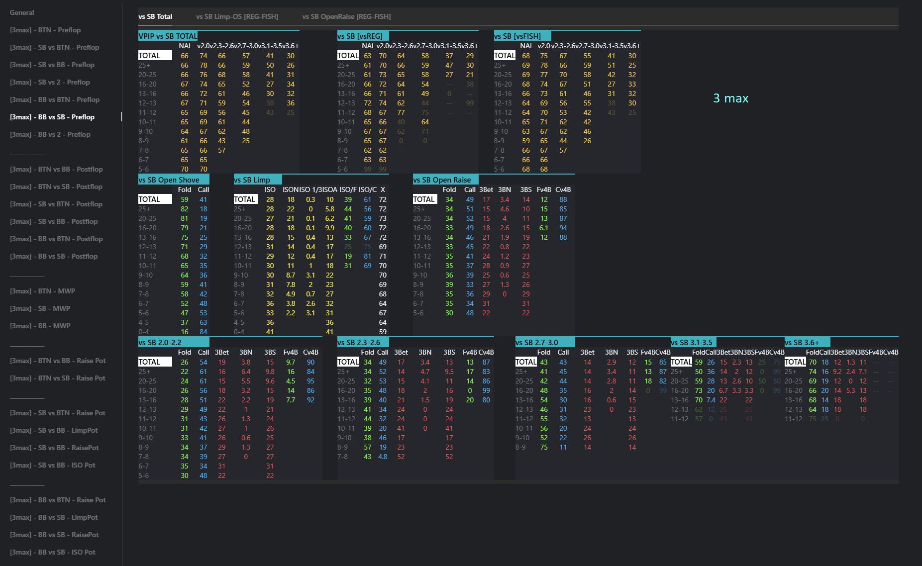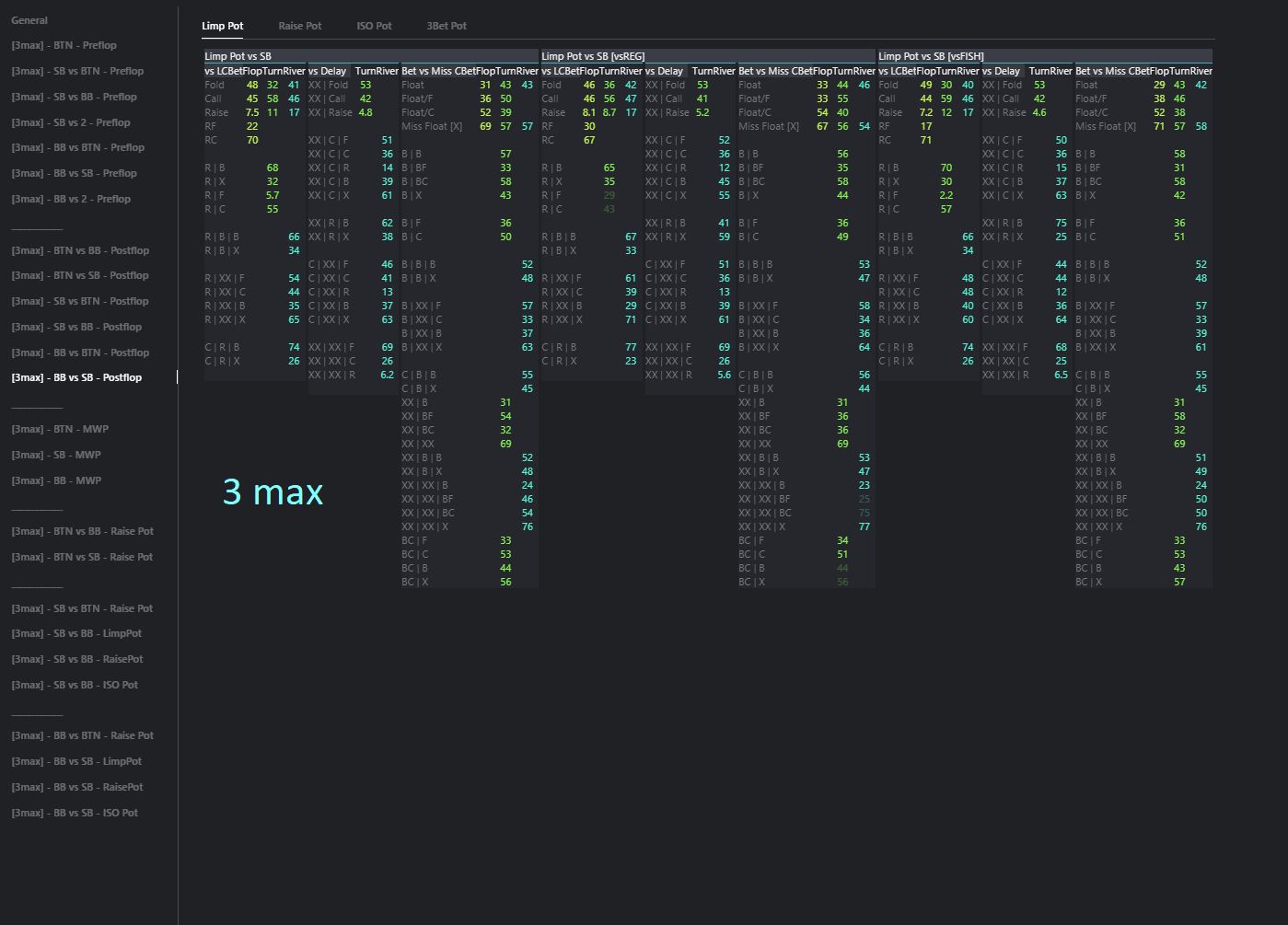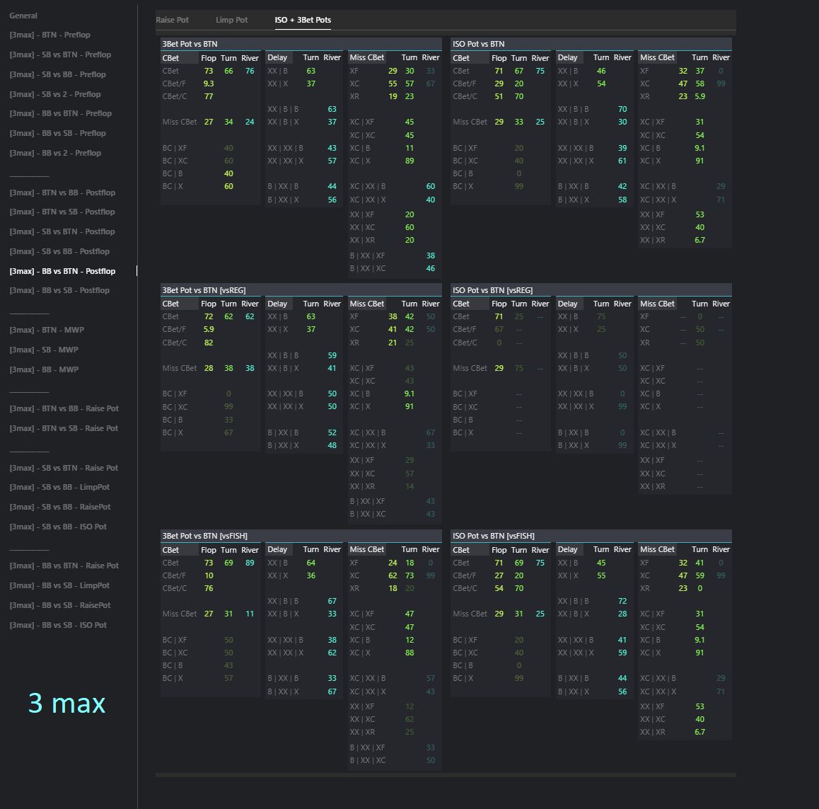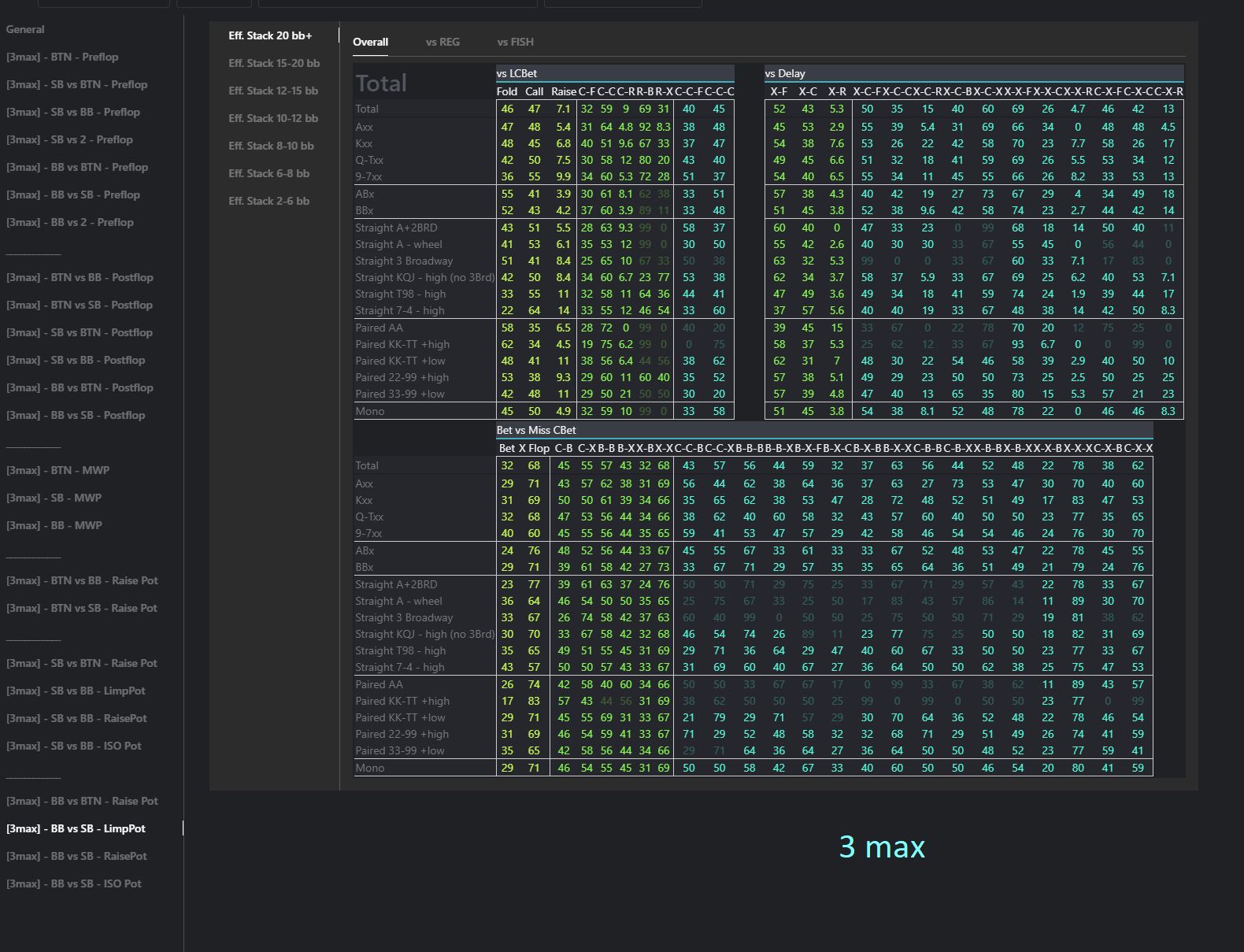 В 3-max каждое позиционное противостояние требует своего подхода. Игра SB против BB включает статистику по Limp Pot, Raise Pot и ISO Pot, причем для изо-банков без разделения по стекам. Аналогично структурирована статистика для BB против SB.