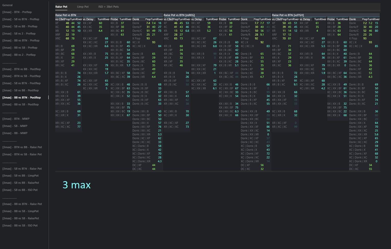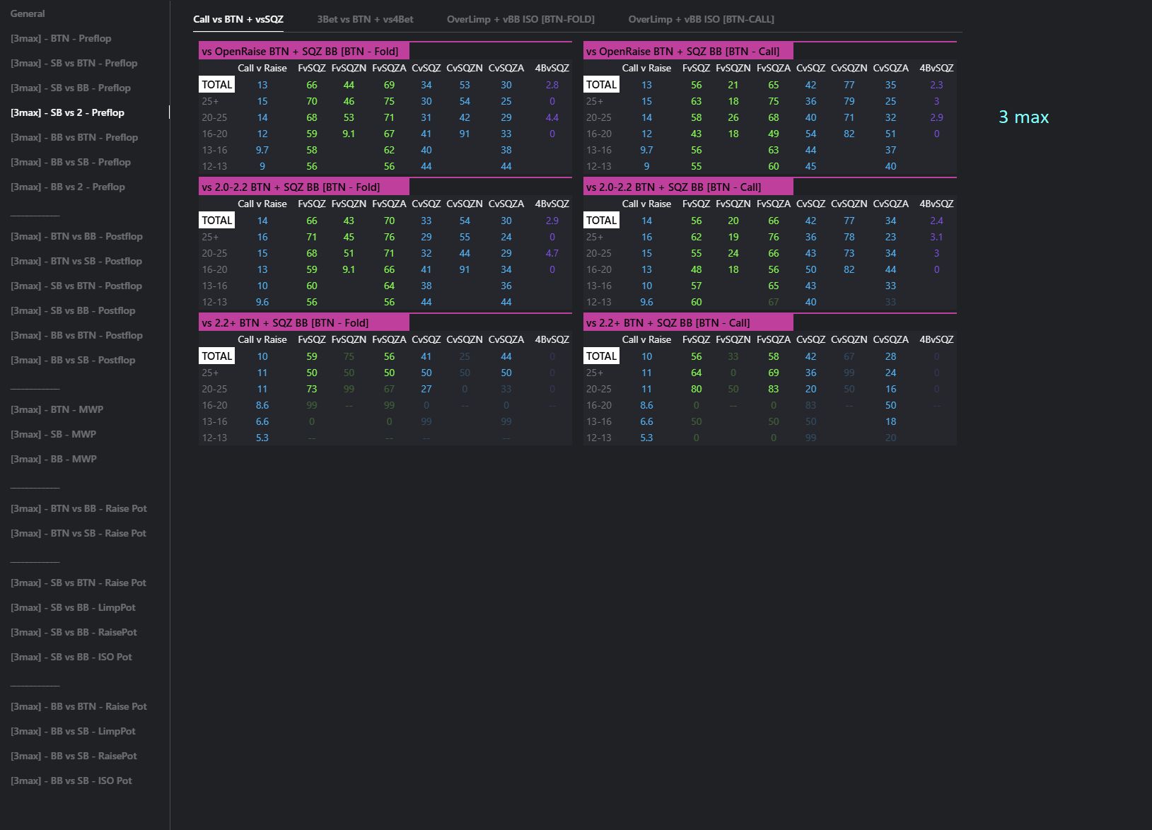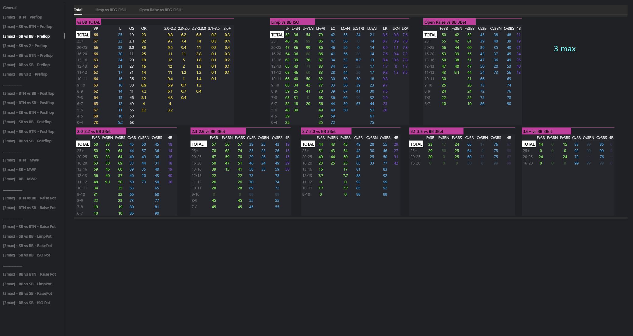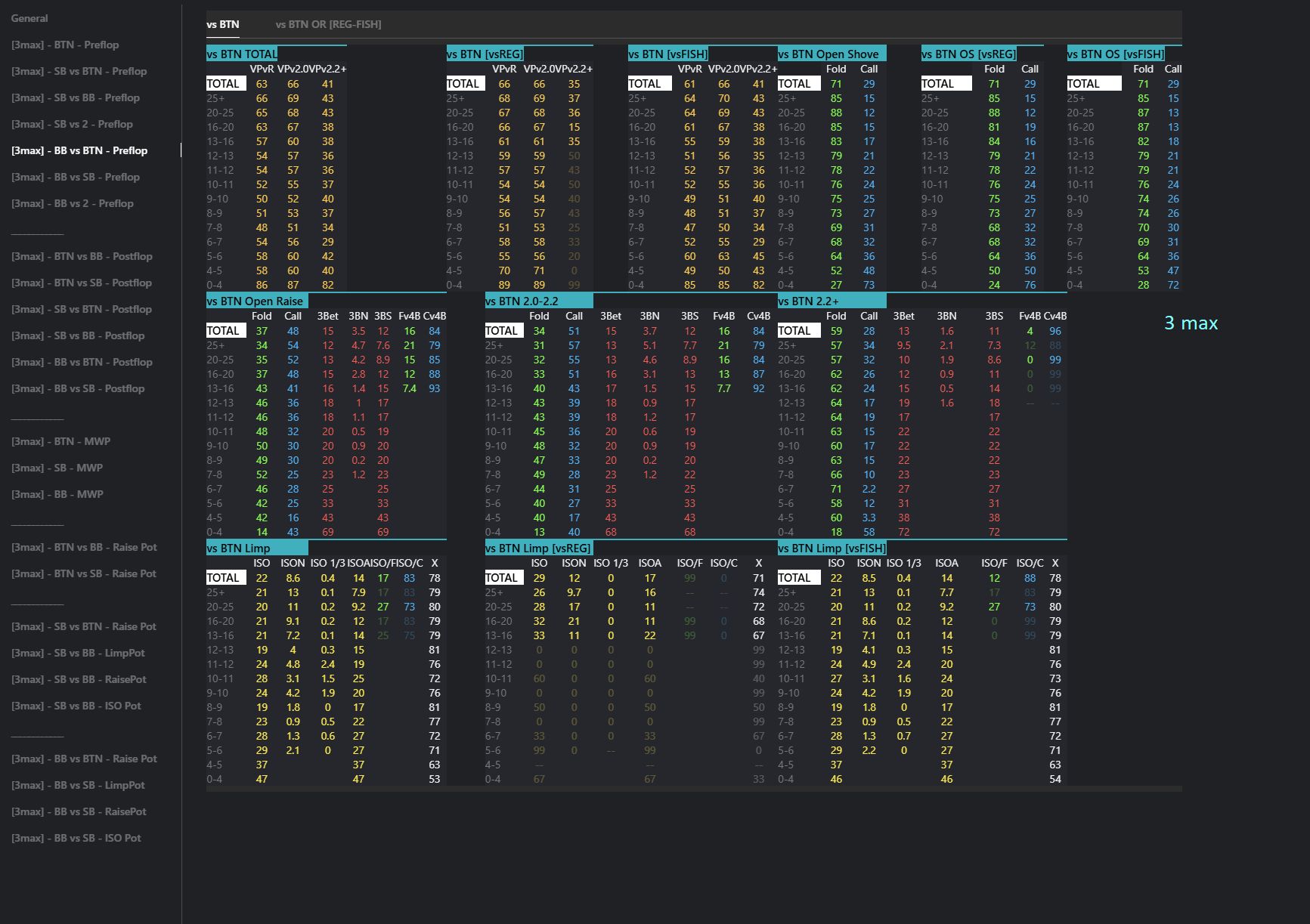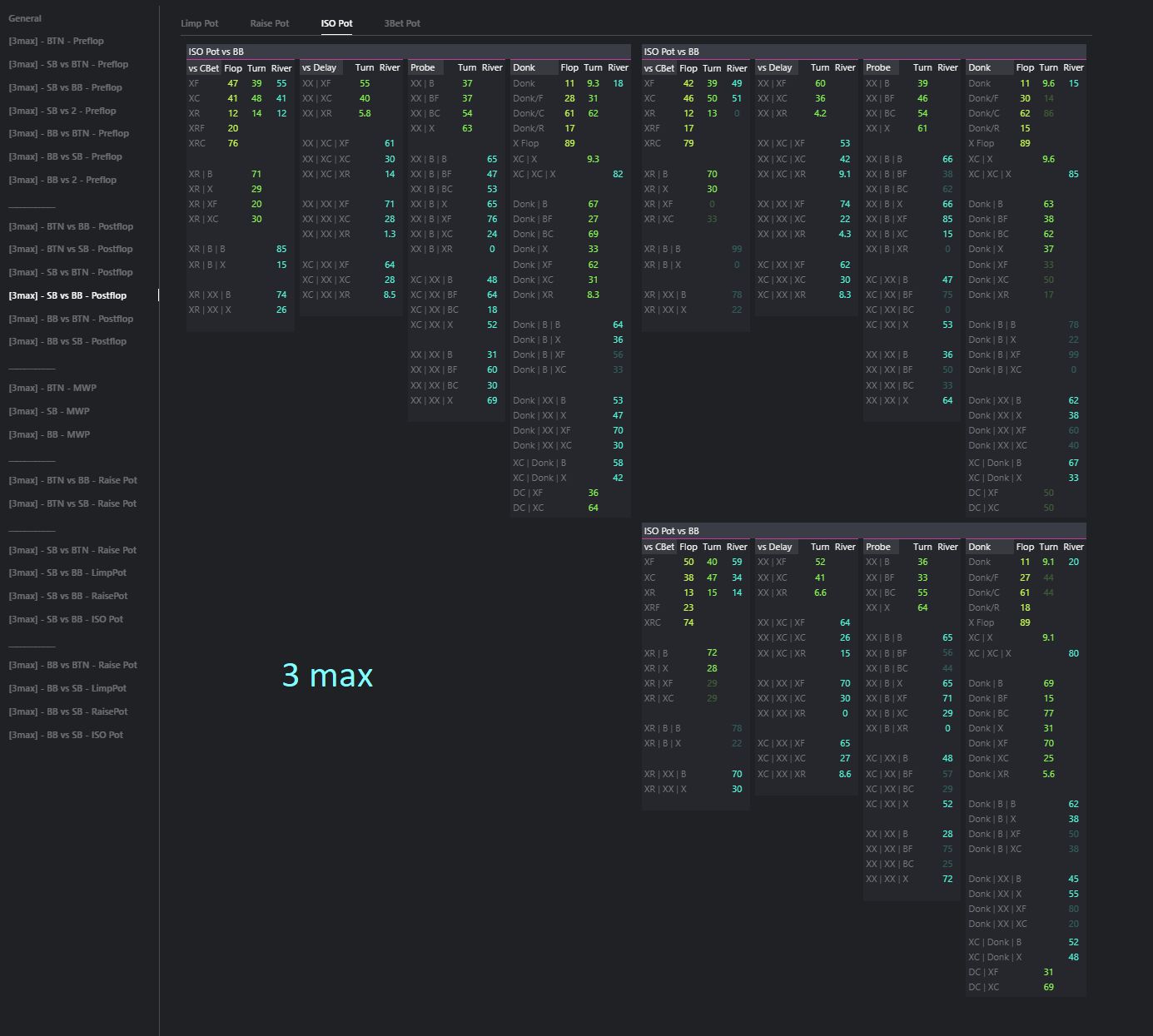 В 3-max каждое позиционное противостояние требует своего подхода. Игра SB против BB включает статистику по Limp Pot, Raise Pot и ISO Pot, причем для изо-банков без разделения по стекам. Аналогично структурирована статистика для BB против SB.